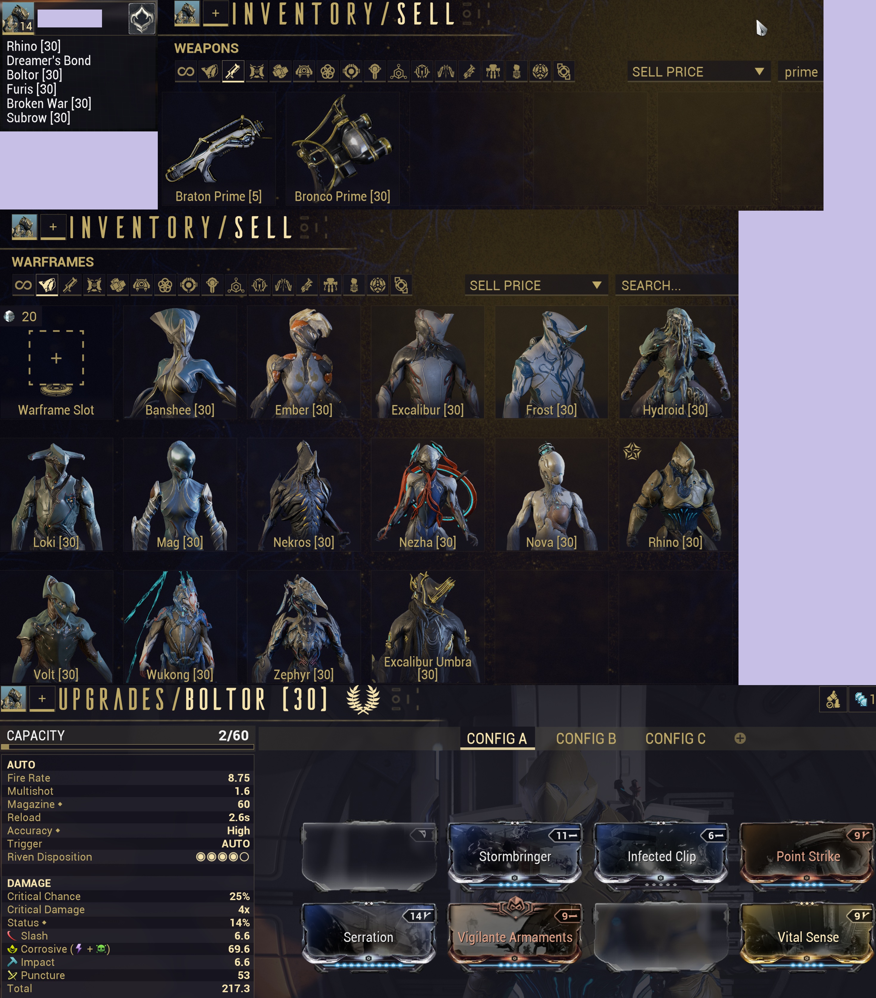 I've been Gaming Hard, on my Steam Deck and Steam Community is down at the moment so I can't access my screenshots which is a bummer, and I have some questions.I hate the Kubrow, is it griefing to run a different companion? all I ever see is people running around with their mutts.is Braton Prime worth investing into, or is it just a bad gun? it's my first prime primary, and I'm almost done with the star chart which means I'm almost ready for Steel Path.I'm out of Platinum and slots, have a few frames and weapons waiting to be claimed, but this is what I'm working with at the moment. I'm trying to figure out what kind of loadouts I want to have saved.is it meta to run a build focused on Nekros third skill for resource farming in Defense/Survival missions? how would he do damage in that case, gun or rely on team?perhaps I should make a stealth loadout too for Spy/Rescue missions?I have been thoroughly unimpressed by everybody except Rhino so far. I love me some Iron Skin and Roar. yes, Loki was my starter frame.and I think I figured out how to make guns deal damage. roast my Boltor build.I swap the elements around based on the mission, but when I'm not using Cold I don't have the capacity to run all maxed out mods because Cold is the only one that matches that polarity, and I have the rifle multishot mod, Split Chamber, but don't have the capacity to run it.thanks broskis. you've helped me a lot so far.