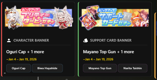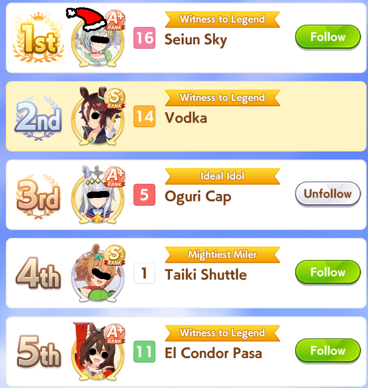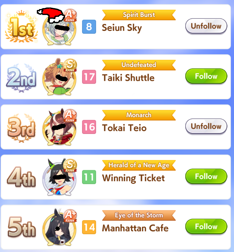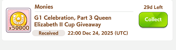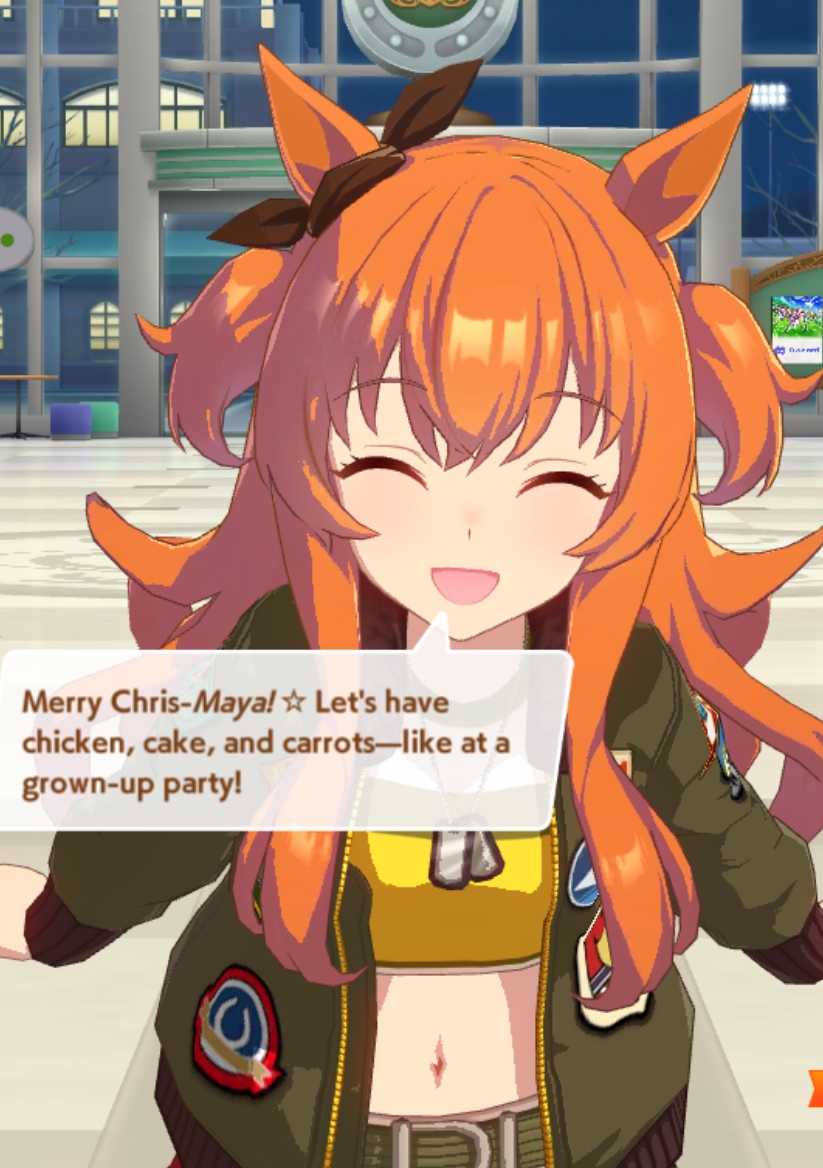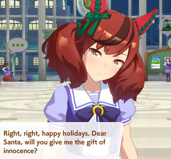 Previous: >>551322369>Global Game NewsLink your account to Cygames iDCurrent Scenario: Aoharu Hai aka "Unity Cup"Current Event: Orchestra in Late AutumnCurrent Rate Up Trainee: Symboli Rudolf 3* (Alt), Gold City 3* (Alt), Tosen Jordan 3*Current Rate Up Support Cards: Curren Chan (SSR), Narita Brian (SSR), Kitasan Black (SSR), El Condor Pasa (SSR)12/24 - Fuji Event12/28 - Scorpio Cup - Tokyo Turf 2000mhttps://umamusume.com/news/100040/https://pages.snep.pw/uma/anni-skill-changes/>JP Game NewsCurrent Rate Up: Oguri Cap 3* (Forma de Cinderella), Stay Gold 3*, Inari One (SSR), Mejiro Dober (SR)New Scenario "Yukoma Hot Spring" releasedTimeline: https://uma.moe/timelineCygames Webstore: https://webstore.cygames.com/en/umamusume_en/>IP NewsUmamusume Cinderella Gray 2nd season started weekly airings on 10/5>Thread Clubshttps://rentry.co/umaglobalclublistYou must be E3 (20k points) to join a circle. Apply with /uma/ or /vg/ in your profile or post ID in the thread.>All Guides & Resourceshttps://rentry.org/uma26Game databasehttps://gametora.com/umamusume (Click the gear to switch between JP / global server info)A basic guide for newfagshttps://rentry.org/umaglobalFind networks if your region is blocked from the game or clienthttps://www.umavpn.top/93Seiyuu & Concertshttps://rentry.org/umstUma Texthttps://umareader.idsmile.xyz/Merry Christmas /uma/, from the Mejiro family!