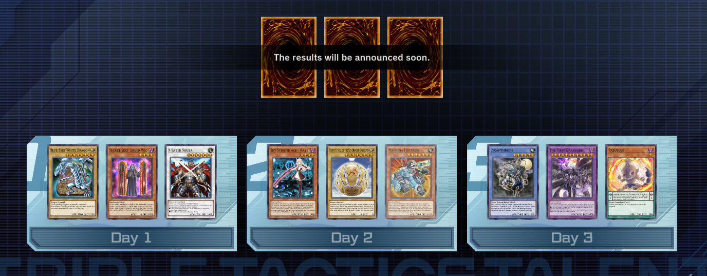 >>551386160My first bet would be they don't want to announce the winner until the rewards are ready to go. Which is retarded because they could've just announced the cards on time and said rewards would be distributed over the day.