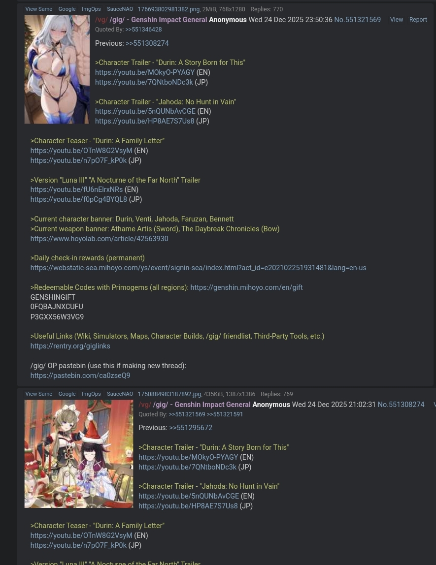 Previous: >>551373739 >Character Trailer - "Durin: A Story Born for This"https://youtu.be/MOkyO-PYAGY (EN)https://youtu.be/7QNtboNDc3k (JP) >Character Trailer - "Jahoda: No Hunt in Vain"https://youtu.be/5nQUNbAvCGE (EN)https://youtu.be/HP8AE7S7Us8 (JP) >Character Teaser - "Durin: A Family Letter"https://youtu.be/OTnW8G2VsyM (EN)https://youtu.be/n7pO7F_kP0k (JP) >Version "Luna III" "A Nocturne of the Far North" Trailerhttps://youtu.be/fU6nElrxNRs (EN)https://youtu.be/f0pCg4BYQL8 (JP) >Current character banner: Durin, Venti, Jahoda, Faruzan, Bennett>Current weapon banner: Athame Artis (Sword), The Daybreak Chronicles (Bow)https://www.hoyolab.com/article/42563930 >Daily check-in rewards (permanent)https://webstatic-sea.mihoyo.com/ys/event/signin-sea/index.html?act_id=e202102251931481&lang=en-us >Redeemable Codes with Primogems (all regions): https://genshin.mihoyo.com/en/giftGENSHINGIFT0FQBAJNXCUFUP3GXX56W3VG9 >Useful Links (Wiki, Simulators, Maps, Character Builds, /gig/ friendlist, Third-Party Tools, etc.)https://rentry.org/giglinks /gig/ OP pastebin (use this if making new thread):https://pastebin.com/ca0zseQ9