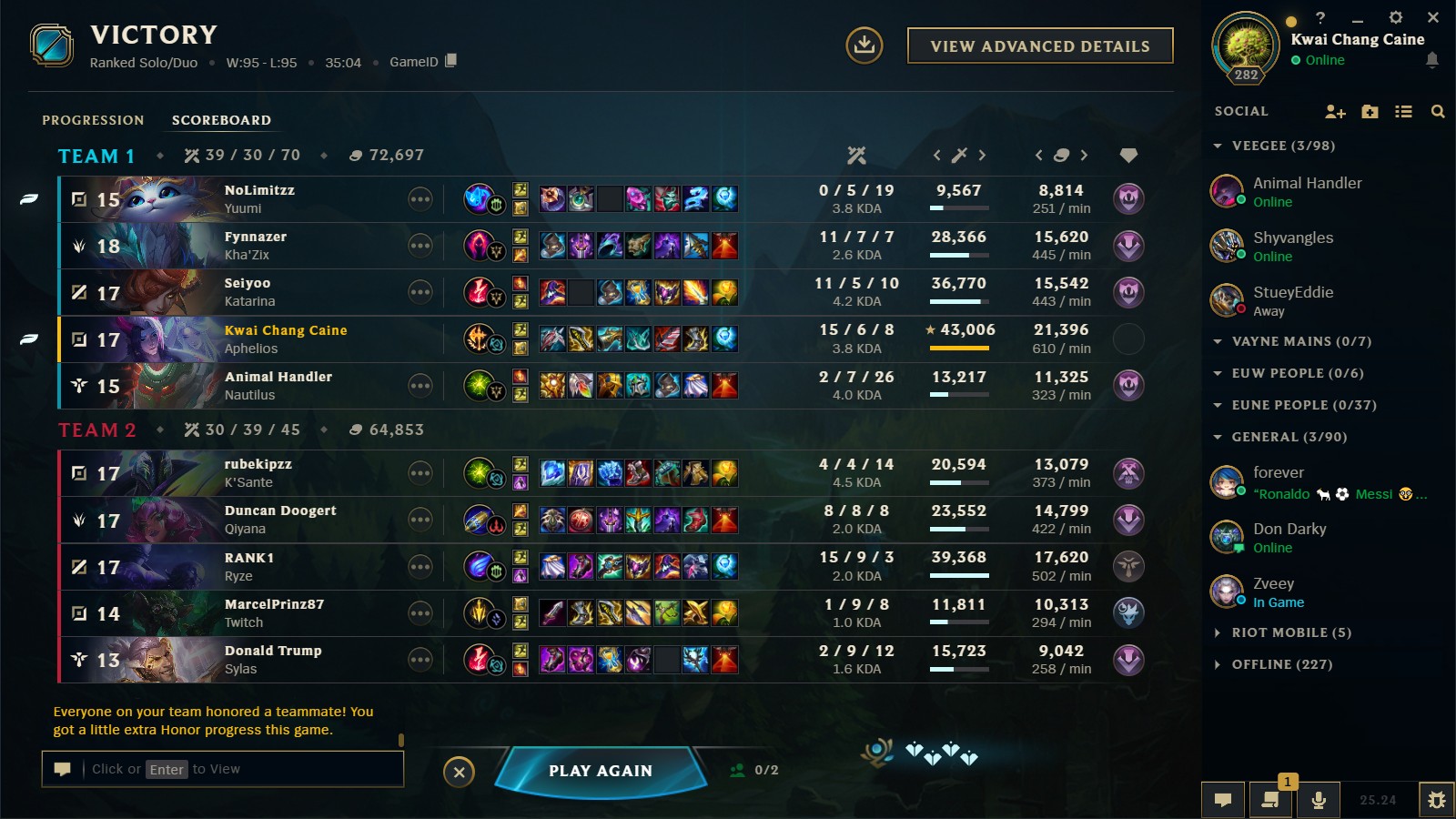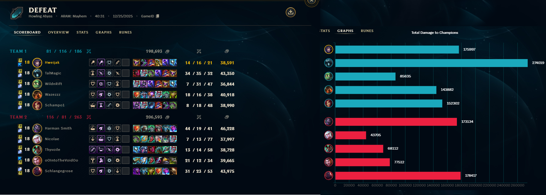 Just had a 40 minute Aram game.Everyone was doing thousands of damage with every ability and everyones damage done was in hundreds of thousands.Was pretty intresting to see what a long game would look like if people could still keep buying stats past 6 items and werent just full build and thats it.Saly didnt get a post game screen screenshot because i disconnected for a bit in the middle of the game so i dont get a post game screen for that.Summoners Rift Mayhem when?