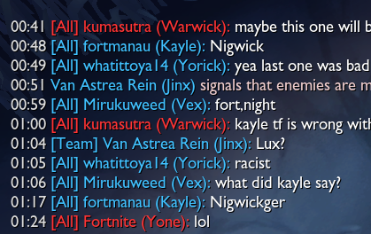 >>551424138They're lying.I run into a blatant "hitchhiker" as Riot likes to call it at least once every other play session. I'd say once every 5 or so games on average.You can report them all you want but if they don't chat they will not see any action.Riot will just say "Oh they're playing with a friend who is a legit new player" even if the "legit new player" is hard stomping every game on a different champ every game too.Not ONCE even have I seen someone get punished for it.The only thing I see people get punished for is afk/disconnecting and chat. That's it.I KNOW Riot doesn't care about "shared accounts" because I've bought some and they all have a very obvious pattern of Stopped playing for 30 or so days immediately after hitting level 30, then showed up at a completely different area in the country and name changed. Never had anything happen.And if they REALLY cared about "hitchhiking" they could prevent 100% of it by removing duo queue and telling the "I wanna play with friends" Kazooie cosplayers to go play flex.