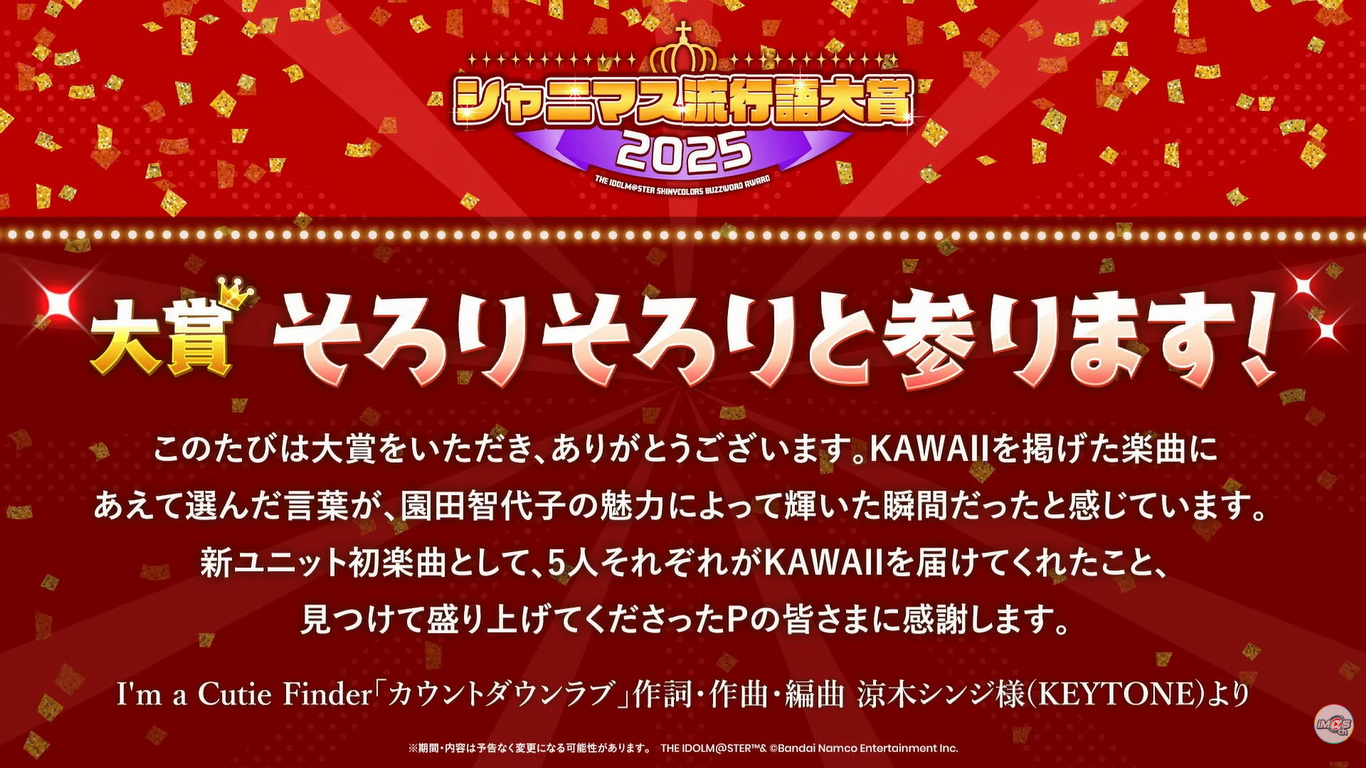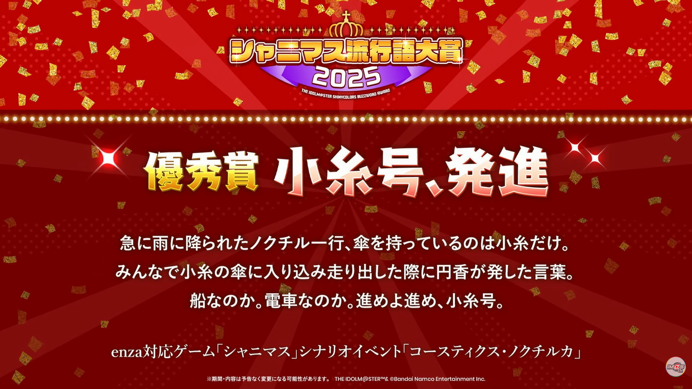 iM@S NEWS ARCHIVE- Archive of >>551400371: archive.is/iBC7m>Million Live- TD Konomi's "Great Conqueror's Game! Hot-Blooded Idol Academy Edition" gacha ad: >>551503378- TD "THEATER TALK PARTY SPECIAL ~ Unit Off Shot Vol.58" Event Update: >>551497408- TD 2025 New Year's Countdown Login Bonus (Dec 26th to Jan 1st): >>551497456- ML x Kuppy Ramune PR Missions (Dec 26th to Jan 7th): >>551473972- ML Chugai Mining merch at Comiket 107 on Dec 30th/31st: >>551502174- ML "Brightest Showcase" Super Large Acrylic Stands were defective: >>551469610- Eat Fish for Christmas: >>551470024>Shiny Colors- SC Gacha Teaser (Dec 26th): >>551481760- SC Leaks (Dec 26th): >>551485858 >>551486031 >>551486529>Gakuen- GK TVCMs (Dec 26th): >>551504380- GK TVCM Commemorative Gacha (Dec 26th): >>551504470 >>551486073 >>551495726 >>551481831- GK TVCM Commemorative Training Packs (Dec 26th): >>551504737>876pro- VL Cosmo and Letora try to dance "Sukisugite METSU!": >>551504763>Other- TOURS Mirai Christmas commu: >>551463593- iM@S 20th Anniversary FUTAMASU!!!!!! Roco manhole will be in Machida City: >>551309993 >>551469196- Tell Kotobukiya to make iM@S merch: >>551470187- Collection of official artbooks and other materials: >>551454210