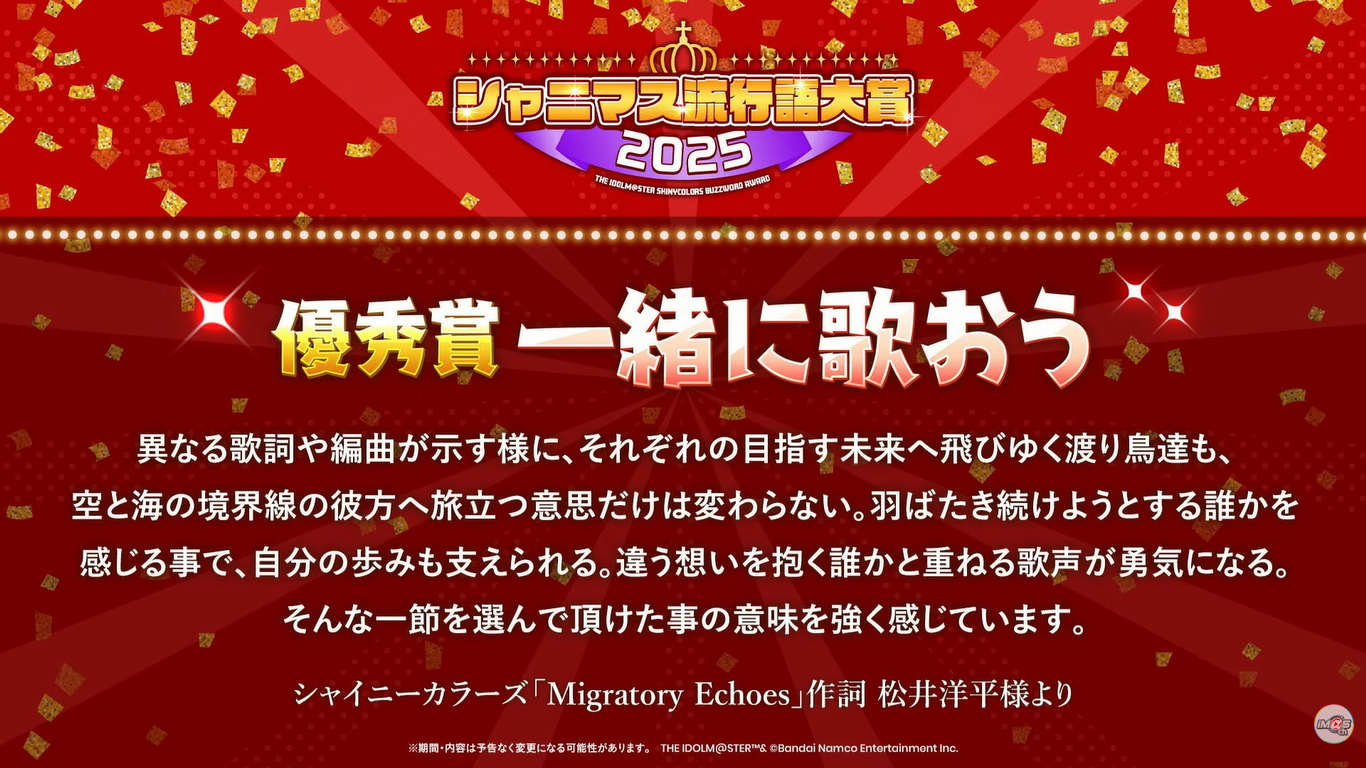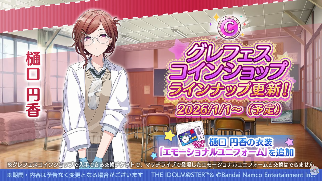 iDOLM@STER ThreadPrevious iM@S Thread: >>551452662Official website: idolmaster-official.jpJapanese news: imasnews765.comEnglish wiki: project-imas.wikiAPKs: apk.ksmz.moeOld archive of materials: sites.google.com/view/yukipobackupOld FAQ + Resource Links: pastebin.com/icRtaLvvMaterial translations + Music downloads: pastebin.com/DebHdukECharacter birthdays: pastebin.com/cLdezeDuNext thread OP: pastebin.com/A5UGxTuBHelpful Links: pastebin.com/Z70CGAsN>Event/Gacha Dates (Dec 25th): >>551408467 >>551408518- Previous News: >>551452686 >>551452785ONGOING:Dec 15th, 8PM JST: Theater Days 8.5th Anniversary 24/7 Live Stream by YamiYummy ch.: youtu.be/x5GL9PZFUwY >>549381152 >>549398049 >>551395923TODAY:Dec 26th, 10AM JST: Gakuen Maintenance (concluded): >>548877847Dec 26th, 6PM JST: SideM CIRCLE OF DELIGHT SOLO COLLECTION 01~04: >>551296005Dec 26th, 7PM JST: Shiny Colors 2025 Shiny's Last Shiny Stream ~Thank you for another year~ stream: youtu.be/Yn4udxb7ZCY nico.ms/lv349354824 >>550432776 >>550429656 >>551300237Dec 26th, 7:30PM JST: VL Cosmo plays Golf It! (members-only): youtu.be/sv8Rei4frs4Dec 26th, 9PM JST: VL Cosmo plays Majo no Ie (The Witch's House): youtu.be/eQadJNywe6wDec 26th, 9PM JST to Jan 6th, 7PM JST: The iDOLM@STER Winter Holiday Playlist 24/7 Stream: youtu.be/v5AUgy4t7B4Dec 26th to Jan 7th: Million Live x Kuppy Ramune eeo POP-UP STORE: >>542235930 >>546474286 >>546475383