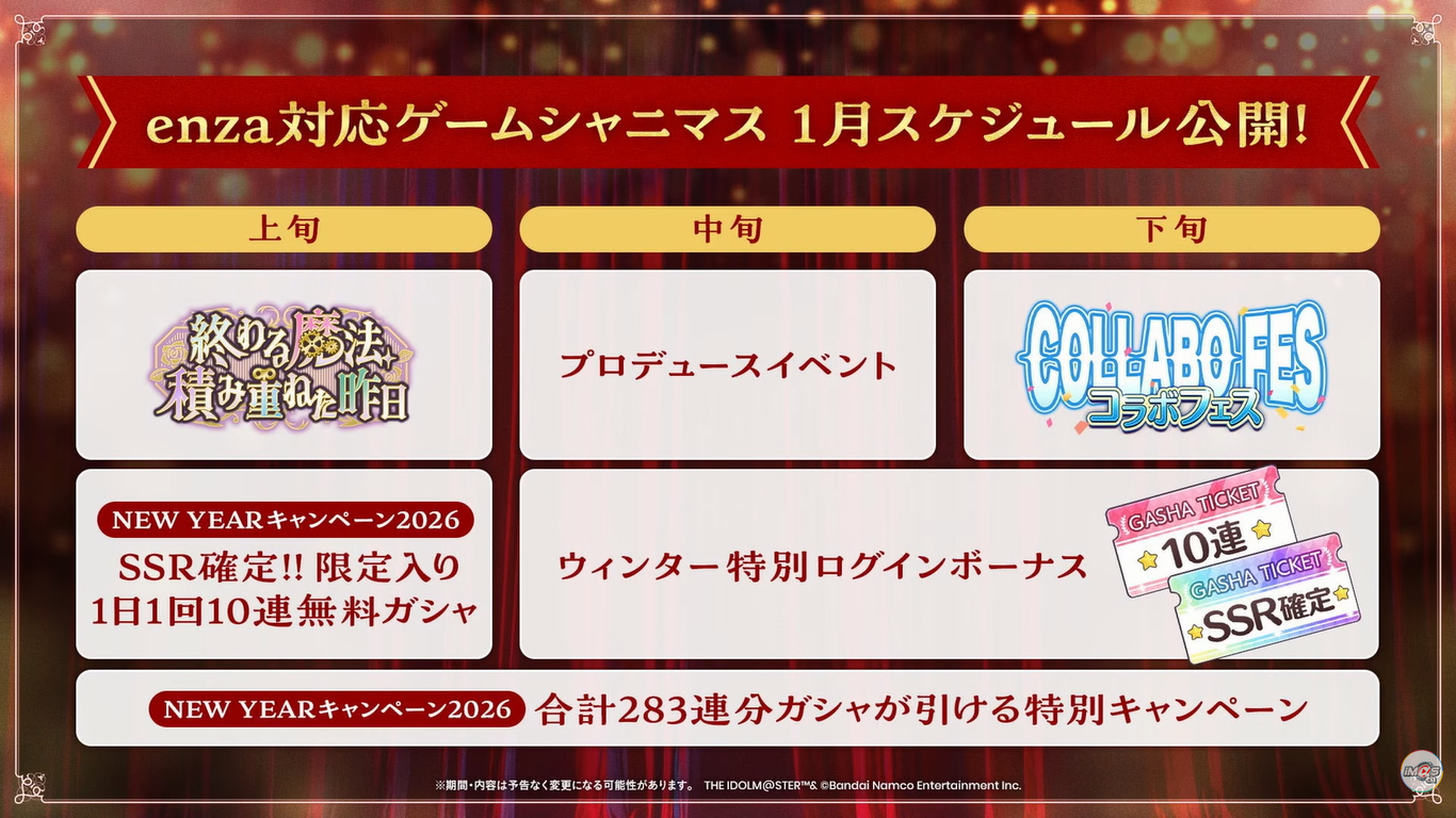 Helpful Linkshttps://pastebin.com/Z70CGAsNSTARLIGHT STAGE>>Event12/01 - 12/31 11:59PM JST SSR Recruitment Challenge12/23 12AM JST - 2026/01/05 LIVE Carnival ~2025 Winter~>>>Gacha09/22~ Platinum Audition Once-a-day Free 1 Roll12/25 - 12/31 11:59PM JST Cinderella Fes Blanc12/25 - 12/31 11:59PM JST Cinderella Fes Noir>>Paid Jewels Only08/22 - 12/31 11:59PM JST Limited Premium Audition {Max: 3}08/22 - 12/31 11:59PM JST Premium Dominant {Max: 3}12/25 - 12/31 11:59PM JST Premium Audition Blanc {Max: 3}12/25 - 12/31 11:59PM JST Premium Audition Noir {Max: 3}THEATER DAYS>>Event10/28 - 12/27 11:59PM JST -Neru Natural Onsen Campaign10/14 - 12/31 11:59PM JST Ministry of the Environment Campaign12/26 - 2026/01/01 11:59PM JST Theater Talk Party ~#UnitOffShot Vol. 58~12/05 - 2026/01/04 Space Create Jiyukukan Campaign07/17 - 2026/06/28 8th Special Training07/23~ 52 Weeks Continuous CD Release Campaign >>>Gacha12/25 - 12/31 2:59PM JST Million Linkage "Dominance! The Hot-Blooded Idol School" (Konomi, Fuka)>>Paid Jewels Only12/09 - 2026/01/11 MOIW2025 Commemoration {Max: 5}GAKUEN>>Event12/26 - 2026/01/01 4:59AM JST Produce Improvement Week12/19 - 2026/01/04 Contest Season 3612/18 - 2026/01/05 Rerun Affection Boost Campaign12/26 - 2026/02/16 Producer Ranking Season 1>>Gacha12/26 - 2026/01/05 Campus mode!! (Tsubame)12/26 - 2026/01/05 Story of Re;IRIS Airing Commemoration12/26 - 2026/02/01 TV CM Commemoration