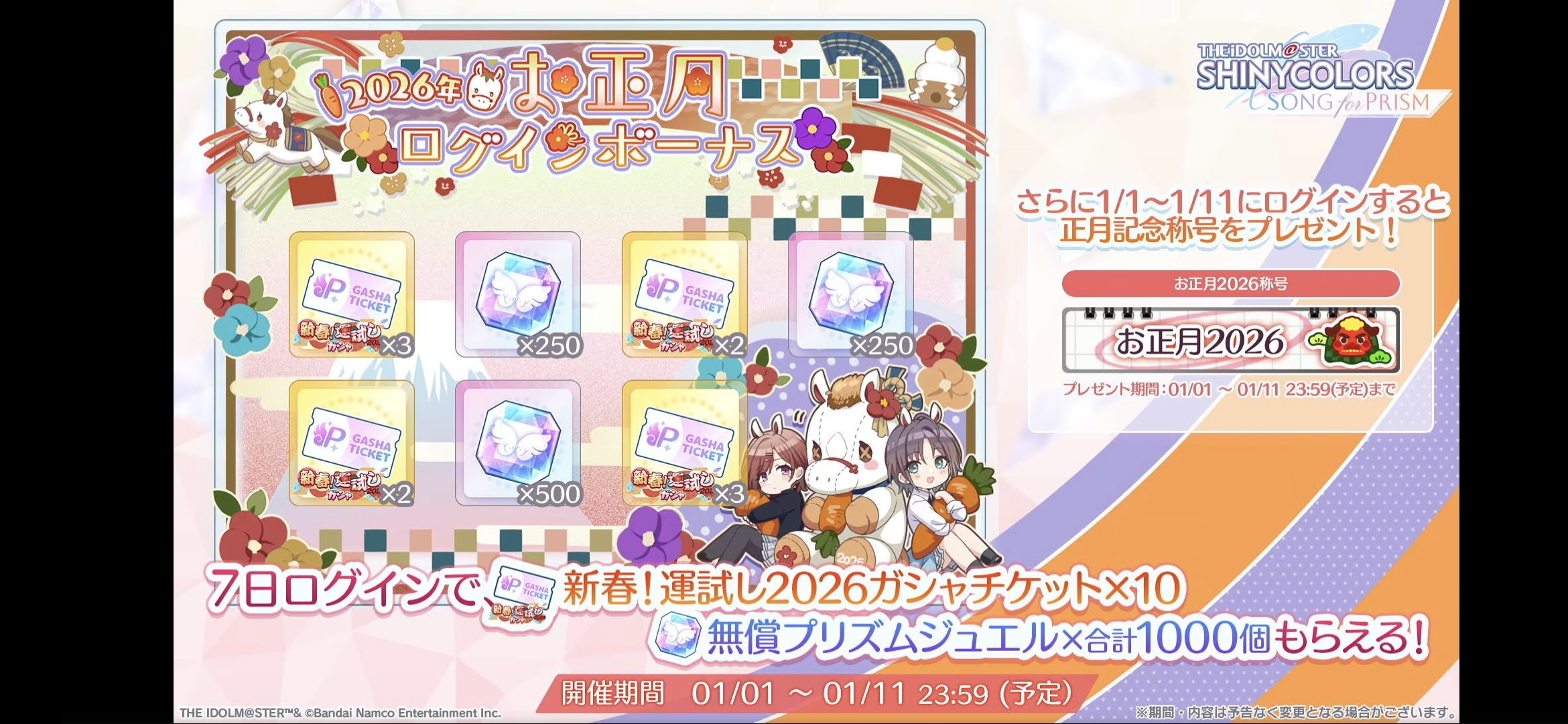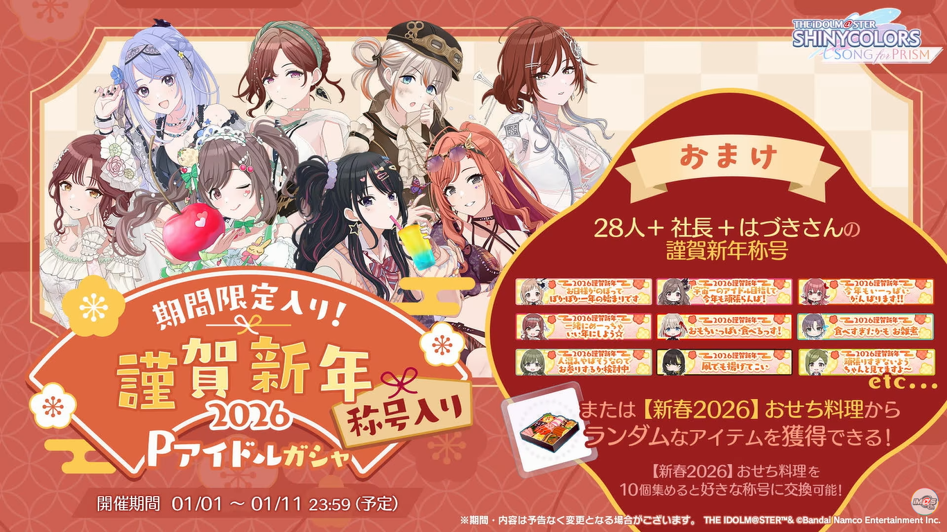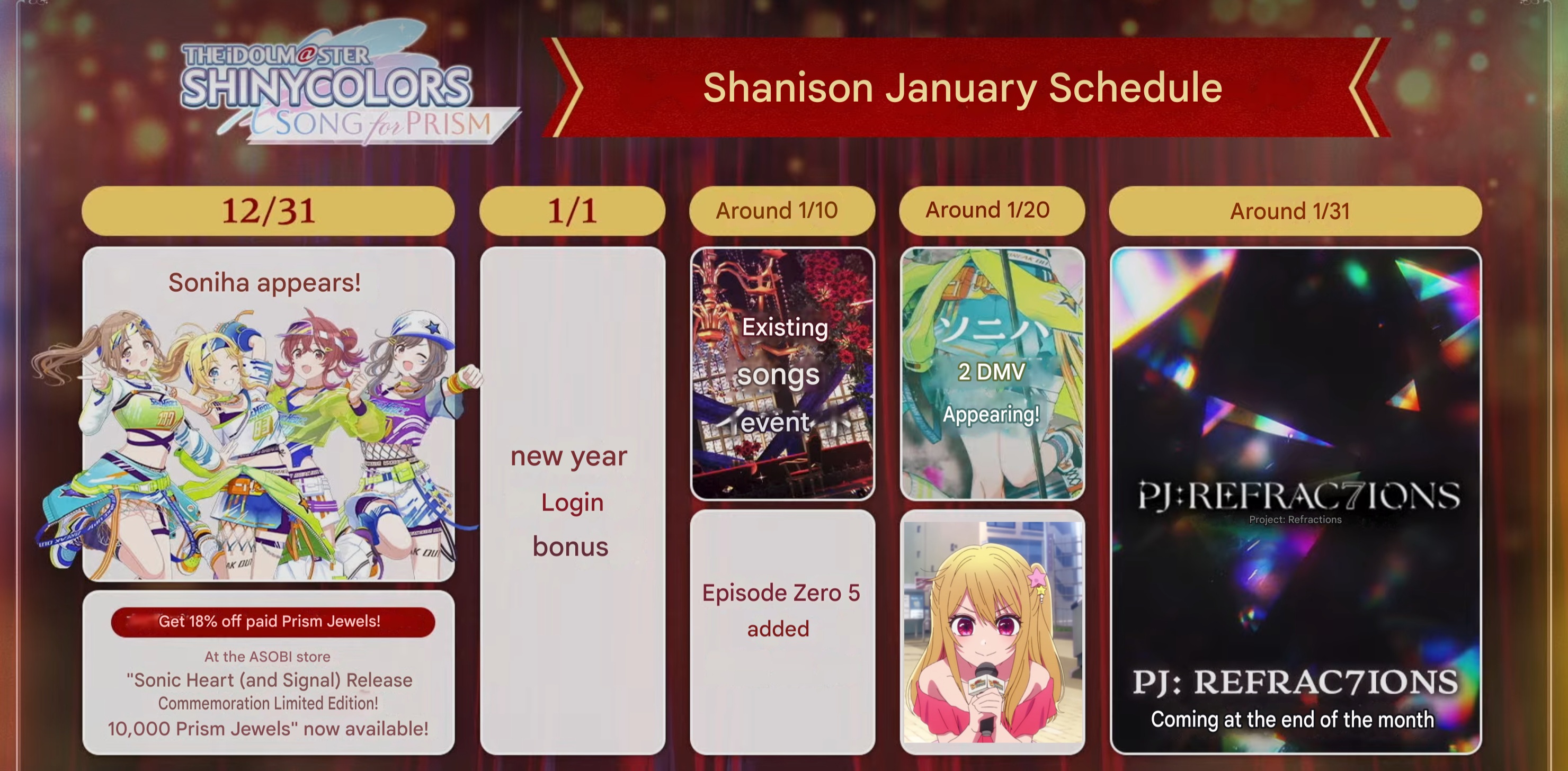 >>551511306SHINY COLORS>>Event12/13 - 12/26 11:59PM JST MOIW2025 Commemoration Select Present12/24 - 12/31 8:59PM JST Shiny Party in DecemberEnds on 12/31 11:59PM JST- Rerun Scenario "Song of the Monsters" (SSRS Kiriko)- 2025 Christmas Present Special Commu- "Beyond the Fruition" (SSRS Haruki)12/26 - 2026/01/05 4:59AM JST MASTERS FES12/08 - 2026/01/05 11:59AM JST "Winter Idol Training Week"12/13 - 2026/01/09 Album Key Present Campaign12/26 - 2026/01/09 New Year Special Mission>>>GachaEnds on 12/31 11:59PM JST- Casting Collection (SSRP Kogane, SSRP Amana)- Year-end Campaign 2025 Once-a-day Free 10 Roll SSR Up to 2X Chance!12/08 - 2026/01/09 Twilights Collection (SSRP Yuika, SSRS Haruki)>>Has Normal and Paid Jewels Only version12/17 - 12/26 11:59AM JST Rerun "A Night When Something Good Happens to Good People" (SSRS Hazuki)12/15 - 12/31 11:59AM JST MOIW2025 Commemoration Niji no Yukue (SSRS Meguru, SSRS Asahi)>>Paid Jewels Only12/24 - 12/27 11:59PM JST Special Pin-up Idol (SSRS Luca)12/17 - 12/31 11:59PM JST JST MASTERS FES Idol (L'Ant & Alstro)12/17 - 2026/01/04 MASTERS FES Idol11/29 - 2026/01/09 Special Comeback Unit Select12/26 - 2026/01/09 New Year Once-a-day Guaranteed SSR RedrawSONG FOR PRISM>>Event11/30 - 12/28 11:59PM JST Season 26 "A Gift of Poinsettia" (SSR Koito)12/20 - 12/31 11:59AM JST New 2D MV Song Mission11/20 - 2026/01/10 Episode Zero Chapter 4 Mission12/20 - 2026/01/31 Portrait Focus Mode>>>Gacha12/24 - 2026/01/10 "Snow Light Memories" (2* Idols)>>Has Normal and Paid Jewels Only versionEnds on 12/31 11:59AM JST- "PJ: REFRAC7IONS - Fumage" (3* Lim Toru, 3* Lim Kiriko)- "Weaving Warmth" (3* Rinze, SSR Rinze)12/24 - 2026/01/10 "Snow Light Memories" [IS & HCG, L'Ant & SHHis, Alstro & CoMETIK, Stray & noct]>>Paid Jewels OnlyEnds on 12/31 11:59PM JST- MOIW2025 P Idol Day 1- MOIW2025 P Idol Day 2- Happy Birthday [3* Tenka, 3* Amana]