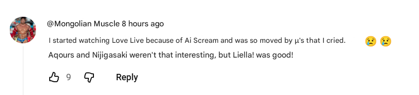 >>551902347It was good.It was my first time going to a LL live and went to 2 different lives even.Scoured the official and secondhand shops for merch. Walked around with a Muse tag on my backpack and people still know them when I point to it when they ask me why I came to Japan.It feels pretty good to have been there for the first performance of AiScReam and the announcement of Ikizuraubu. What a tremendous deception, it was just tweets in the end.Nevertheless, I'm losing interest. I'm not really liking the latest music. For example, only Ichigo milk tea and New Black caught my attention from the recent discography. Also, there is less interesting content for me, to watch, listen and to discuss.The subbed Hasu episodes I watched were pretty boring so I stopped watching them. I like Ceras, but to think about watching 2 years of content to catch up is too big of a hurdle.So I've been pivoting to other multimedia franchises and paying less attention to LL.