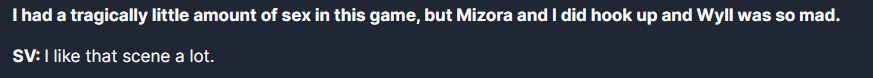 >>551817917Sort of. Mizora has orders to not actually impede the party's progress towards destroying the brain, since Zariel has incentive for them to succeed. It's the same reason she stops trying to kill Karl. We don't really know what Mizora would be like if she wasn't under orders to not actually do anything serious. And given the fact that she murders Wyll's father herself if Wyll tries to break the pact, we're actually shown that she's a pretty terrible person. Even if you accept that her trying to make a new pact for Wyll's soul under false pretenses is just cutthroat business and not truly evil (she misinformed him that he needed her to save him, which was a lie), there's no actual reason for her to take it upon herself to murder Wyll's father. So she's actually quite evil.Vampire spawn are just cursed people, they haven't lost their sense of self yet, so they will be whatever personality they were before becoming a spawn. They are under magical compulsion to follow their sire's orders, so we don't hold Astarion's actions against him as they relate to his seducing hundreds of people to be murdered by Cazador. Astarion is thankful if you talk him out of the black mass, and he learns that what he was truly after the whole time is freedom, he just mistook power as the only segue to freedom. He's happy just being free. So I actually do agree that Astarion is overall not that bad at his core, despite the various odd or cruel things he approves of throughout the game.Minthara is still evil since she holds some of the mores of her culture, but everything she says regarding how she would run the nation is actually just standard stuff that real life nations do and have done forever. Her position on immigration, the role of the press, the role of leaders, etc are just standard realistic and standard fantasy LE stuff. Her personal desire for a stable, loving relationship is also very counter-cultural, so she's not like most drow.