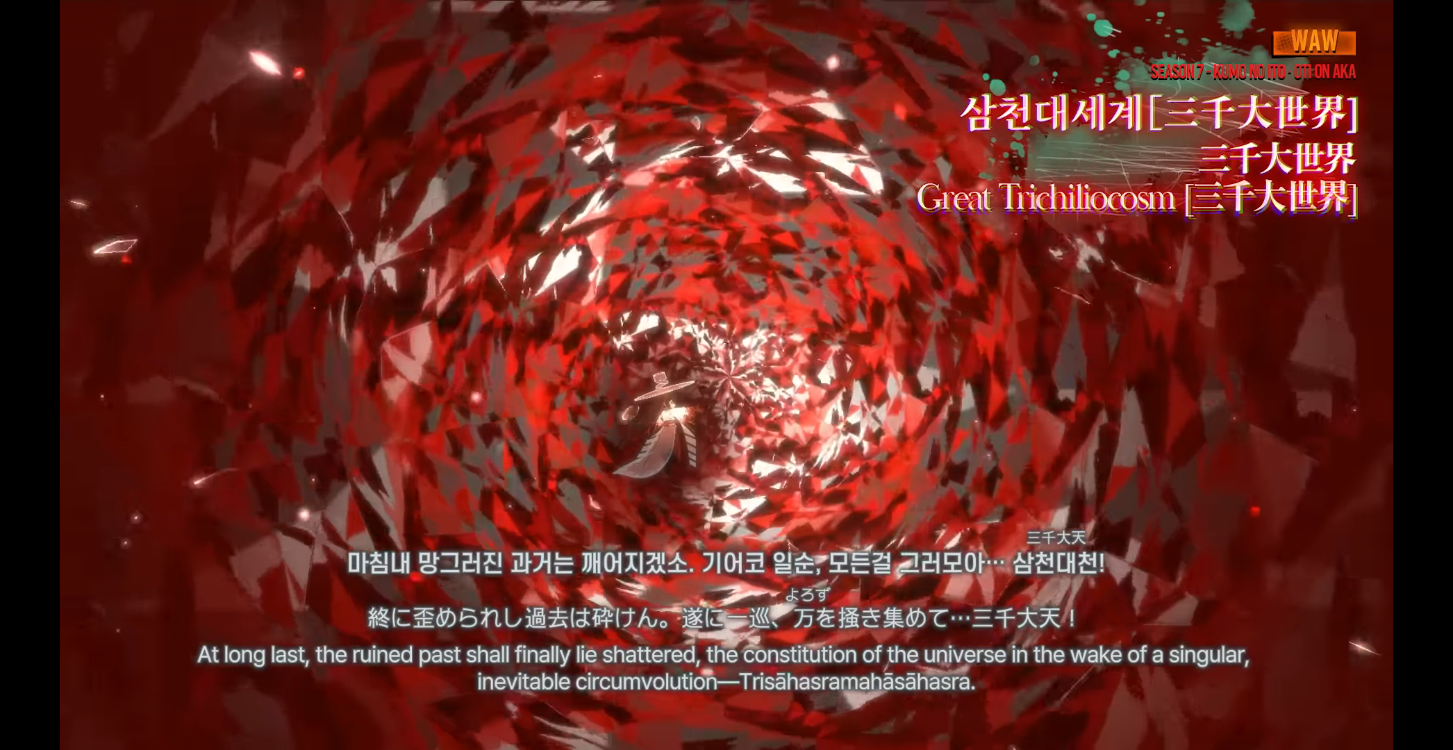 >The three severings:>Reforge the past a thousandfold to cut it apart, reface the future a thousandfold to rip it apart,>Rive the ksana of circumvolution another thousandfold, SanzendaisekaiApparently this is relates to Buddhism? It also half sounds like a similar allegory to "Face the fear, build the future", except here she wants to rip the future apart.