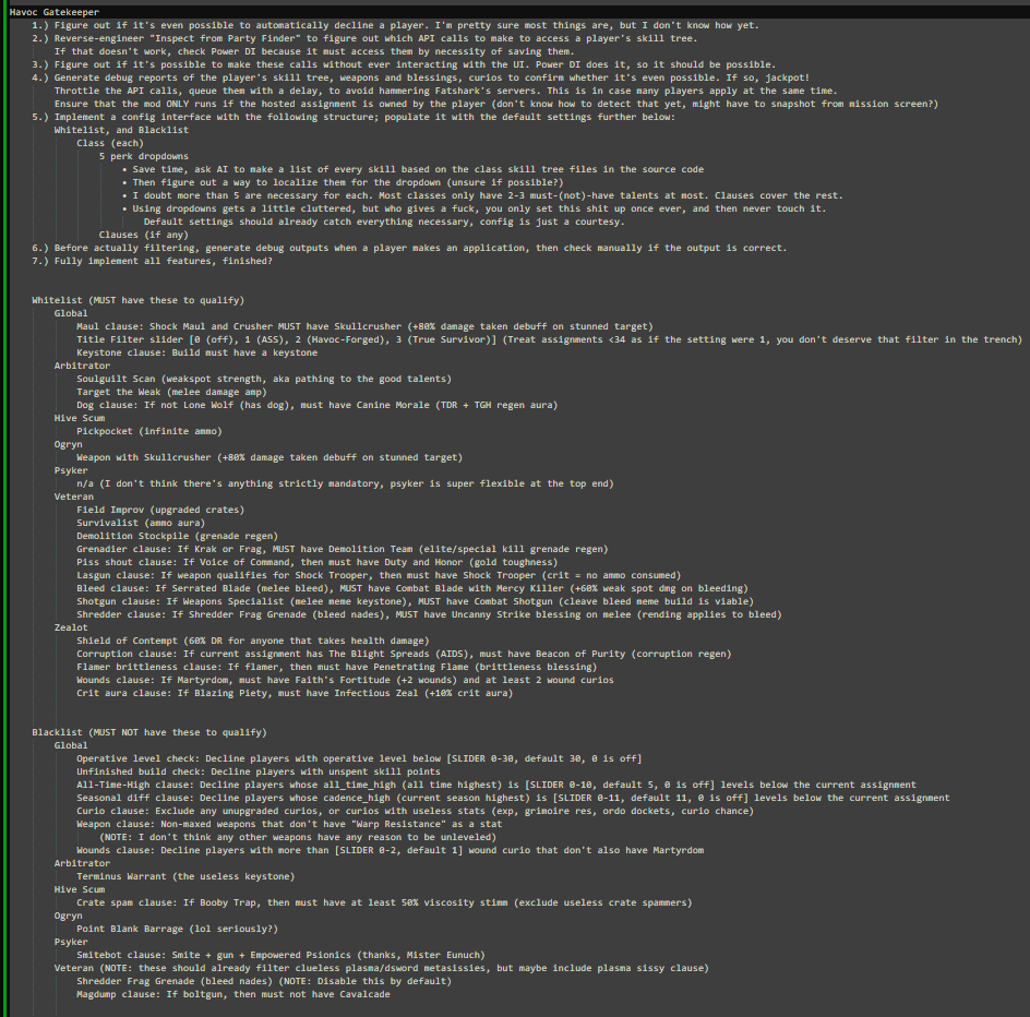 >>551613830>Pickaxe ogryns on suicide watch.Unfortunately true. Pickaxe has been pushed out of the meta by the armored enemy HP buffs, no longer one-shotting relevant targets is terrible. I also never accepted pickaxe ogryns in the first place, Skullcrusher is far too valuable to give up.>>all_time_high>Does fatshark even use it anymore?Yes, both havoc stats work. At least the backend uses it. Truelevel normally only shows one, but I've hacked that to show both.>I don't get it, are you mocking tryhards? But this is a non-tryhard filter list?Plasma/dsword is the most known build and the only players that use it are terrible at the game and think it's some GIGA OP CRUTCH 100% WIN RATE build, but they don't know how to play.>Shredder frags are fine (outside of rotten armor).I disagree entirely. They don't contribute anything meaningful, because you never bring a vet to solve horde clear. Not the vet's job. I never want mine to have frags in 40.>Serrated blade is fine (with a mercy killer knife).Good point. I'll make it a special clause to allow knives.>Weapons specialist is fine (with a bleed shotgun).That's literally the only exception, but you are right, I'll make that a special clause as well.>You should add wound curios to the filter Yeah, I just wrote down>Wounds clause: If Martyrdom, must have Faith's Fortitude (+2 wounds) and at least 2 wound curios>Crit aura clause: If Blazing Piety, must have Infectious Zeal (+10% crit aura)This is probably a scalding hot take, but I unironically think having +1 wound is actually fine. Most players at 40 already maximize revive speed, which I KNOW also helps assist speed, but un-netting someone a picosecond faster isn't what makes it worth taking, it's reviving someone faster. I don't mind bringing a psyker or scum with +1 wound. Missing out on +17% toughness will never protect you from the things that already erase your health bar.