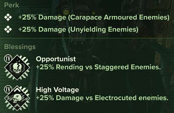 >>551622467>>551622563stat buff: damage_vs_electrocutedAgainst enemies who are under the effect of electrocution, increases any damage (see values below) including explosions and DoTs while the weapon is wielded; stacks additively with other damage buffs, and multiplicatively with power level buffs.Electrocution can be applied by:Source SpecificsArbites Shock Maul • regular attacks and weapon special attacks: if the attack staggers the target and has an armor damage modifier against the attacked hit zone greater than 0.6Exterminator Shotgun Mk III • weapon special: on shock shell hitElektrokinetic Staff • secondary attack: on hitShock Mauls • regular attacks: if the attack staggers the target and has an armor damage modifier against the attacked hit zone greater than 0.6• weapon special: on hitShock Mauls & Shield • regular attacks: if the attack staggers the target and has an armor damage modifier against the attacked hit zone greater than 0.6Enervating Threshold • Psyker talent: on shield staggerLightning Reflexes • weapon blessing: on perfect blockOverwhelming Force • weapon blessing: on hit if the attack staggers the target and has an armor damage modifier against the attacked hit zone greater than 0.6Remote Detonation • Arbitrator Blitz abilitySmite • Psyker combat ability• Charged Strike: on heavy attackStunstorm Grenade • Zealot Blitz abilityVoltaic Mandibles Augment • Arbitrator talent: on Cyber-Mastiff attackVoltaic Shock Mine • Arbitrator Blitz ability