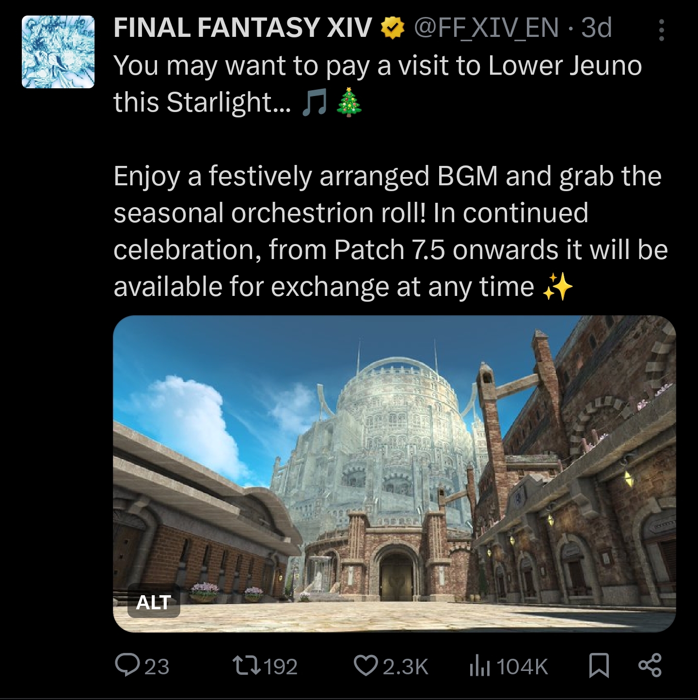 >Patch 7.4 Noteshttps://na.finalfantasyxiv.com/lodestone/topics/detail/06944d892fd98cc00b2a28ff77edbafa4f7eef54>Starlight Celebration (Dec 17 - Dec 31)https://na.finalfantasyxiv.com/lodestone/special/2025/Starlight_Celebration/1zy049rho1>Heavensturn (Dec 31 - Jan 15)https://na.finalfantasyxiv.com/lodestone/special/2026/Heavensturn/xqnas3t3m1>Resourceshttps://rentry.org/xivgresources>Meetups• December 27, 6:00 PM PST | Goblin, Crystal - Tuliyollal ( 17.2 , 11.6 ) | OC CE Fates >>550441897• December 30, 10:00 PM EST | Balmung, Goblet, 24 38 | Winter Orgy >>551594463 • December 31st, 5:30pm EST | Malboro Shirogane Ward 15 Subdivision (X10 Y:8) | NYE Meetup >>551554478 Previous: >>551610992