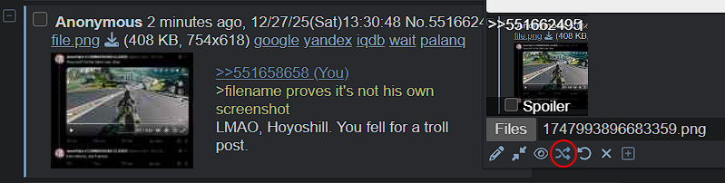 >>551658658>filename proves it's not his own screenshotLMAO, Hoyoshill. You fell for a troll post.