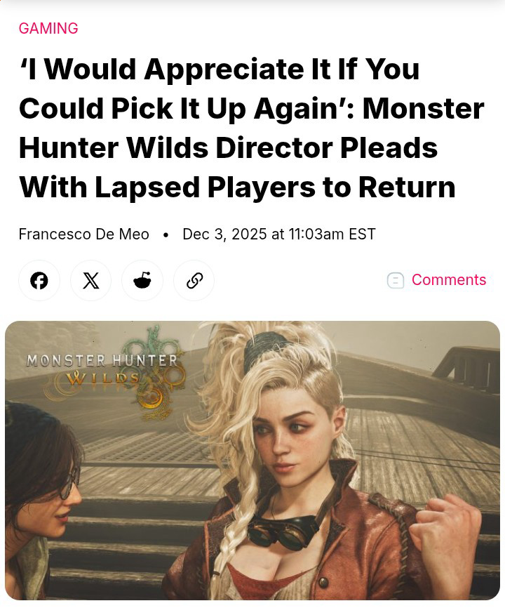 That “huntress” you’re simping for is a grown-ass man’s barbie doll. You know that, right?>I have a question about Monster Hunter!https://pastebin.com/D3zuHuqK>MH Stories 3: Twisted ReflectionRELEASE DATE: MARCH 13, 2026Official Website: https://www.monsterhunter.com/stories3/en-us/Steam Store: https://store.steampowered.com/app/2852190/Monster_Hunter_Stories_3_Twisted_Reflection/Announcement Trailer: https://www.youtube.com/watch?v=XszCdDNI-ls Introduction Video: https://www.youtube.com/watch?v=ps6yAI5THmM Habitat Restoration Trailer: https://www.youtube.com/watch?v=764b4_5dZJg Gameplay Video: https://www.youtube.com/watch?v=6JDesEGUuO4 >MH WildsWilds Info: https://www.monsterhunter.com/wilds/en-us/Steam Page: https://store.steampowered.com/app/2246340/Monster_Hunter_Wilds/Event Quest Schedule: https://info.monsterhunter.com/wilds/event-quest/en-us/scheduleTU4 Trailer: https://www.youtube.com/watch?v=Aijx69md9pU TU4 Changes: https://info.monsterhunter.com/wilds/update/en-us/Ver.1.040.00.00.html/mhg/ Persistent Lobby Info: https://i.imgur.com/M7MmPid.jpeg>MH RiseRise on Steam Store: https://store.steampowered.com/app/1446780/MONSTER_HUNTER_RISE/Sunbreak on Steam Store: https://store.steampowered.com/app/1880360/Monster_Hunter_Rise_Sunbreak/General Info: https://pastebin.com/rewGysVq>MH WorldWorld on Steam Store: https://store.steampowered.com/app/582010/Monster_Hunter_World/Iceborne on Steam Store: https://store.steampowered.com/app/1118010/Monster_Hunter_World_Iceborne/General Info: https://pastebin.com/PKeD8Smg>Older Game Emulation and Multiplayer/Frontierhttps://pastebin.com/fYyeU0kY>Databaseshttps://kiranico.com/>Where does /vg/ play?/mhg/ has its own squad in Wilds: RL9XQ7VMPost the game, platform, room code, and password (7243/rage)>/mhg/ OP Template (use this when making new threads)https://pastebin.com/K3FHwGprPrevious thread: >>551598914