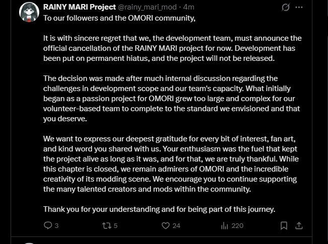 I agree though, announcing that the demo was delayed to only announce it was canceled shortly after wouldn’t really make sense.