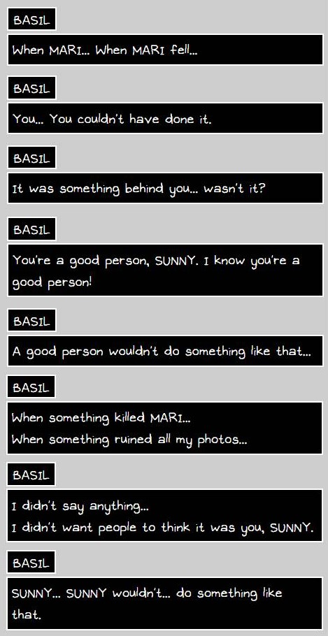 They were close friends prior to the incident. Basil connected with Sunny more than he did the other friends. Basil seemed more comfortable around Sunny. Basil would open up to Sunny and vent to him about his problems, something Aubrey also did with Sunny. One of Basil's photo album descriptions describes Sunny as the baby of the group they had to protect since he was the youngest. When we meet Basil in his room, he mentions taking photos of what he was most afraid to lose. Considering his home life, he probably had abandonment issues of some kind. His friends a lot to him, but Sunny was most important.