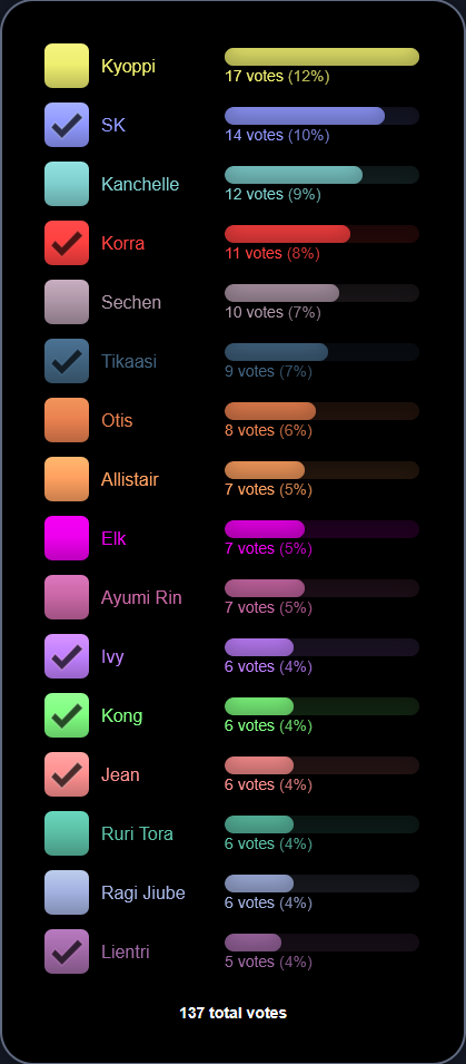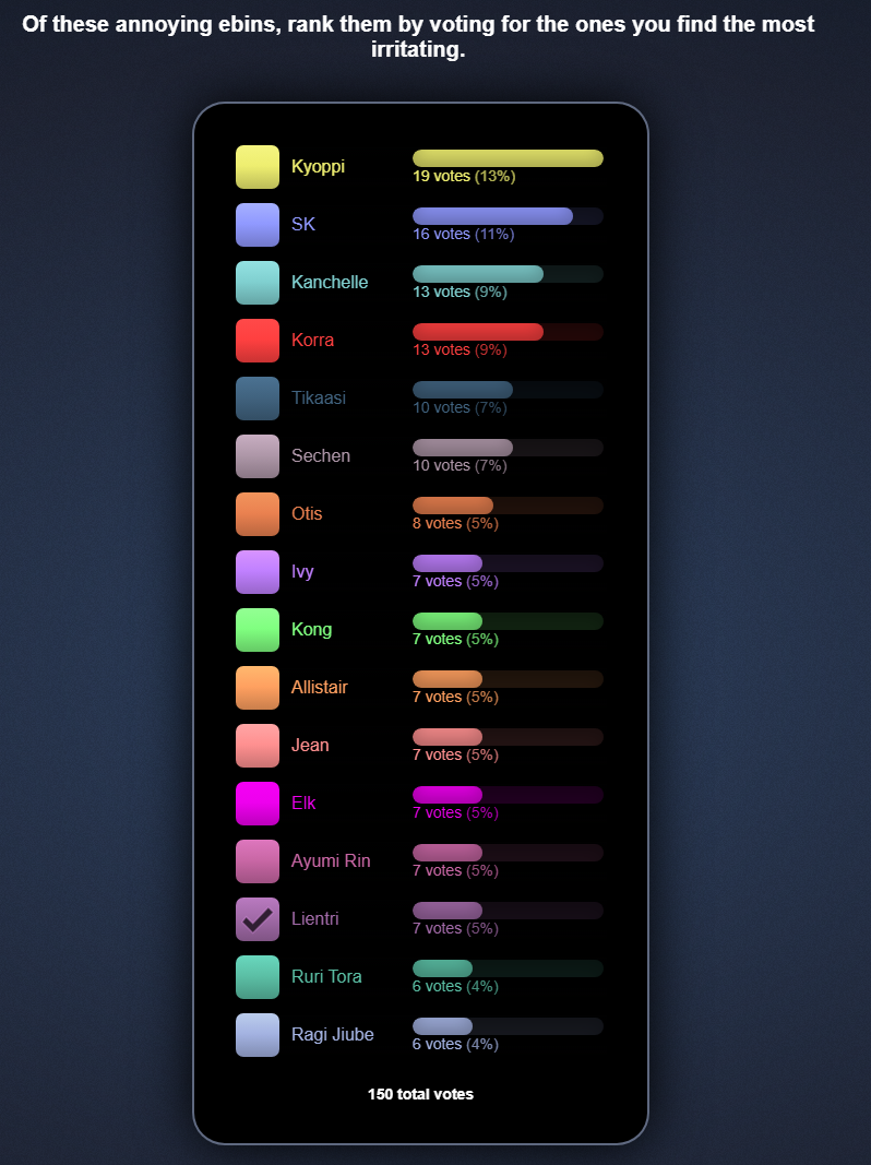 >>551719205most annoying ebins>ivy>SK>allistair>elk>kanchelle>kong>jean>kyoppiKORRA