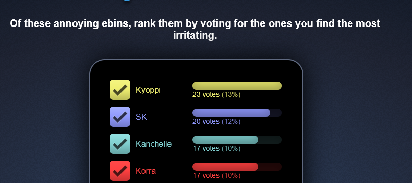 most annoying ebins>ivy>SK>allistair>elk>kanchelle>kong>jean>kyoppi