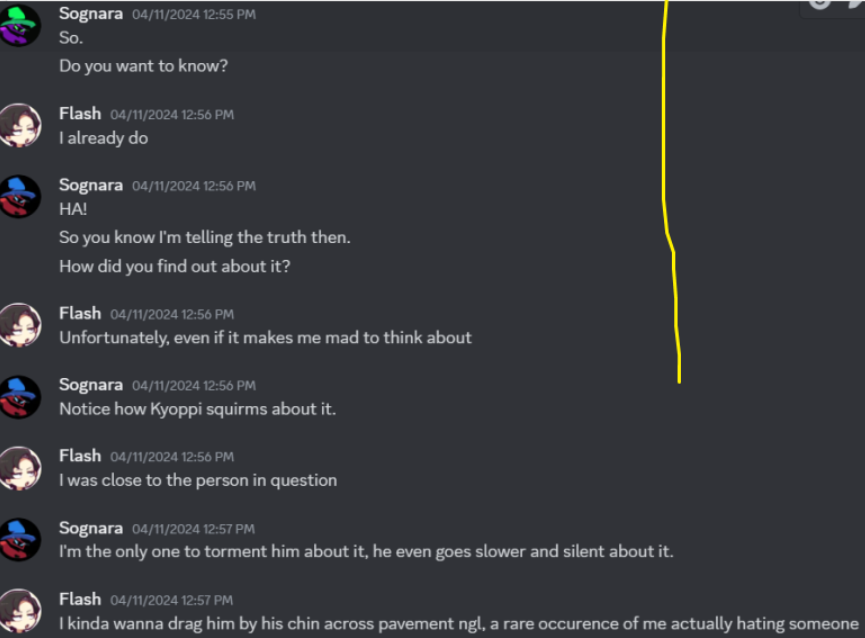 >>551727383I never once tried to throw him out of the server he whines about because he lies about what even happened, what actually happened is that the server owner is someone I'd known a literal decade and when he joined, 4 other people went to him in private asking for him to be removed and he did so, AFTERWARDS he asked me if their concerns were valid and I'd backed them since I'd seen the evidence for myself, and then publicly backed said evidence in that discord because I didn't mind taking the target for him to focus his shitposting on since yes he is obviously one of the people I had in mind and people know his word means nothing>>551727374happy now? he can shit fling and start it here but I'm not going to cast the first stone, I will only respond to clear things up