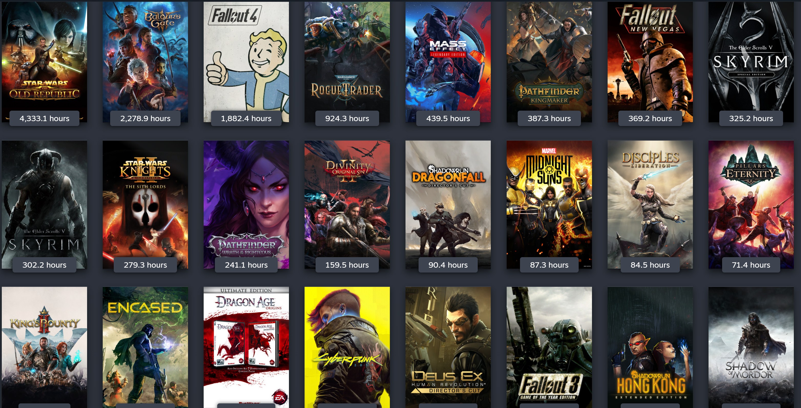 Arcanum, Baldur's Gate, Disco Elysium, Divinity: Original Sin, Dragon Age, Expeditions, Fallout, Icewind Dale, Jade Empire, Necromancer's Tale, Neverwinter Nights, Pathfinder, Solasta: Crown of the Magister, Pillars of Eternity, Planescape: Torment, Shadowrun, The Age of Decadence, Temple of Elemental Evil, Tyranny, UnderRail, Vampire: The Masquerade – Bloodlines, Warhammer 40k: Dark Heresy, Rogue Trader, Wasteland, Wizardry, and many others.