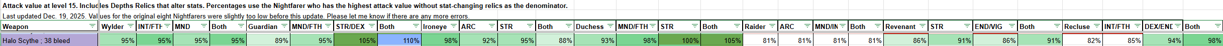 >>551753590Your weapon scaling spreadsheet bro? (keep in mind 100% is the highest damage on a particular nightfarer sans respecs)They gave Guardian a cracked quality respec as a pity buff, he is consistently highest damage on a great chunk of weapons in the gameCouldn't capture the full list but you get the idea