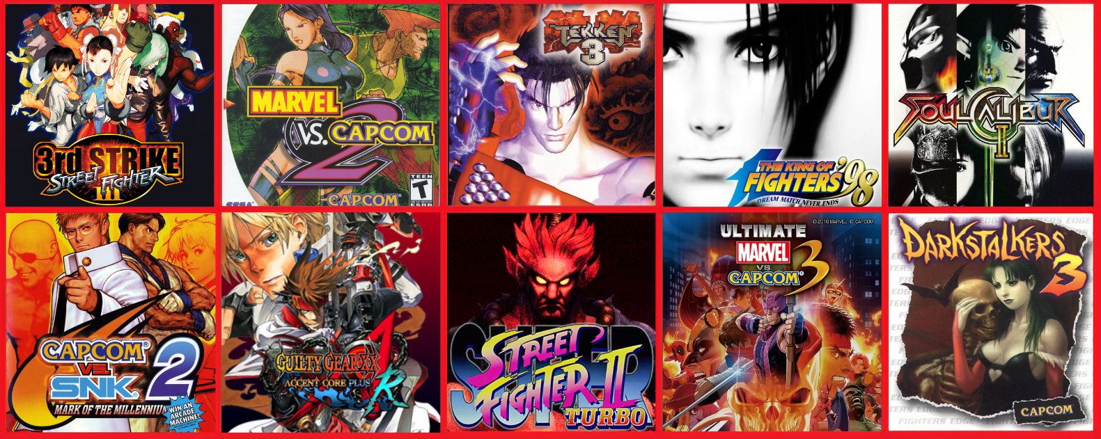 Top ten fighting games:Super turboCvs2Alpha 3Ssf4ae Umvc3Kof02KofxiiiDoa5Soul calibur 2Melee