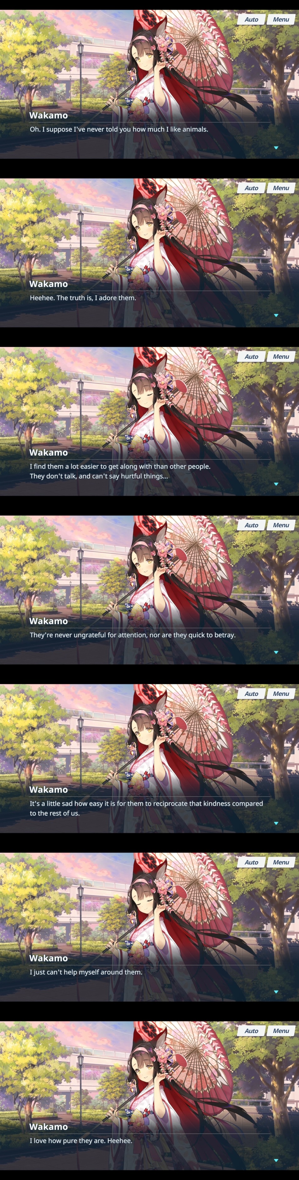 Her momotalks mention she has an easier time trusting animals than actual people, from which coupled with her ending up as a violent terrorist you can infer that her past wasn't particularly happy. She's been traumatized to the extent that she latched onto the first person who treated her with genuine kindness and obsessively pursues him. It's a very disturbed sort of love. Or I'm just reading too deeply into a blatant waifubait character archetype, either is possible.