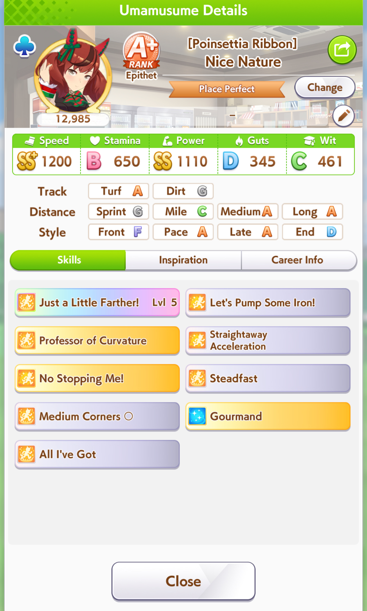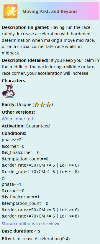 >>551816608I'm not the dev for why it's in there for like, game balance reasons. If it will be slightly more reliable than Ryan, which is any corner late race but must be 6th, then they probably feel a need to constrain it somehow instead of just being "Ryan but works from 5th and 6th". So they put the phase==1 in there to constrain it to a particular corner rather than just any late race corner. So yeah this does make it non-viable on certain tracks, for example upcoming tenno sho CM, it's not going to be a good inherit. Would proc at the start of final corner and expire before late race hits. You'd get some value on Dober herself, since non-inherited it lasts longer, long enough that it would still be active for a bit, but inherited is a no-go. It's still good on a ton of tracks, like it would have been good on kikuka sho which we just did, and it will also be good on arima kinen which I think is next(?)