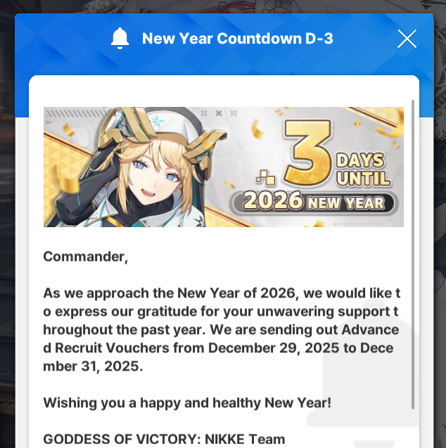 >December 29 LivestreamEN: https://www.youtube.com/live/9UC0otkeykoKR: https://www.youtube.com/live/6AkIsvzO0WQJP: https://www.youtube.com/live/754YEUnHl38>Game Download - Android/iOS/PChttps://nikke-en.com/index.html>General Info/FAQ for New Playershttps://rentry.org/NikkeInfo>Additional Linkshttps://rentry.org/nikghomeALL DATES/TIMES LISTED BELOW ARE UTC+9 (KOREA TIME)>Update on December 4https://nikke-en.com/newsdetail.html?content_id=254d33c5af95fa4a26aa933a5020c508da59>Developer's Note: December 2025https://nikke-en.com/newsdetail.html?content_id=cdd4dd28a9a71a464ca8afdac52e5bb9b7fb>Current EventsTERMINUS TICKET - December 4 ~ December 30>Upcoming EventsUnion Raid - Jan 2 ~ Jan 8Co-Op: Chatterbox - Jan 2 ~ Jan 4>Current Special RecruitsBrid: Silent Track - Dec 11 ~ Dec 31>Upcoming Special RecruitsTBA>Current Costume PassesBlanc: Fortune Express [Gacha] - December 4 ~ December 30Bready - Frosty Bite [Mission Pass] - December 4 ~ December 30Emma - Color Me Red, Vesti - Ark Mage & Volume - Beat the Gun [Shop rerun] - December 4 ~ December 30Jackal: Class Troublemaker [Mission Pass] - Dec 1 ~ Dec 31>CodesN/APrevious: >>551773046