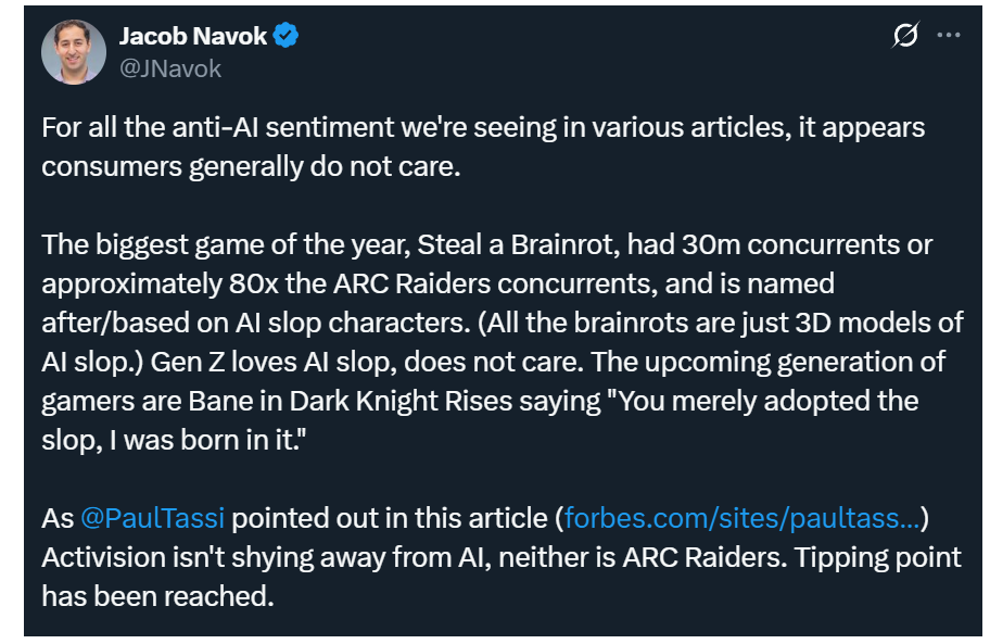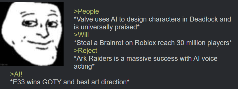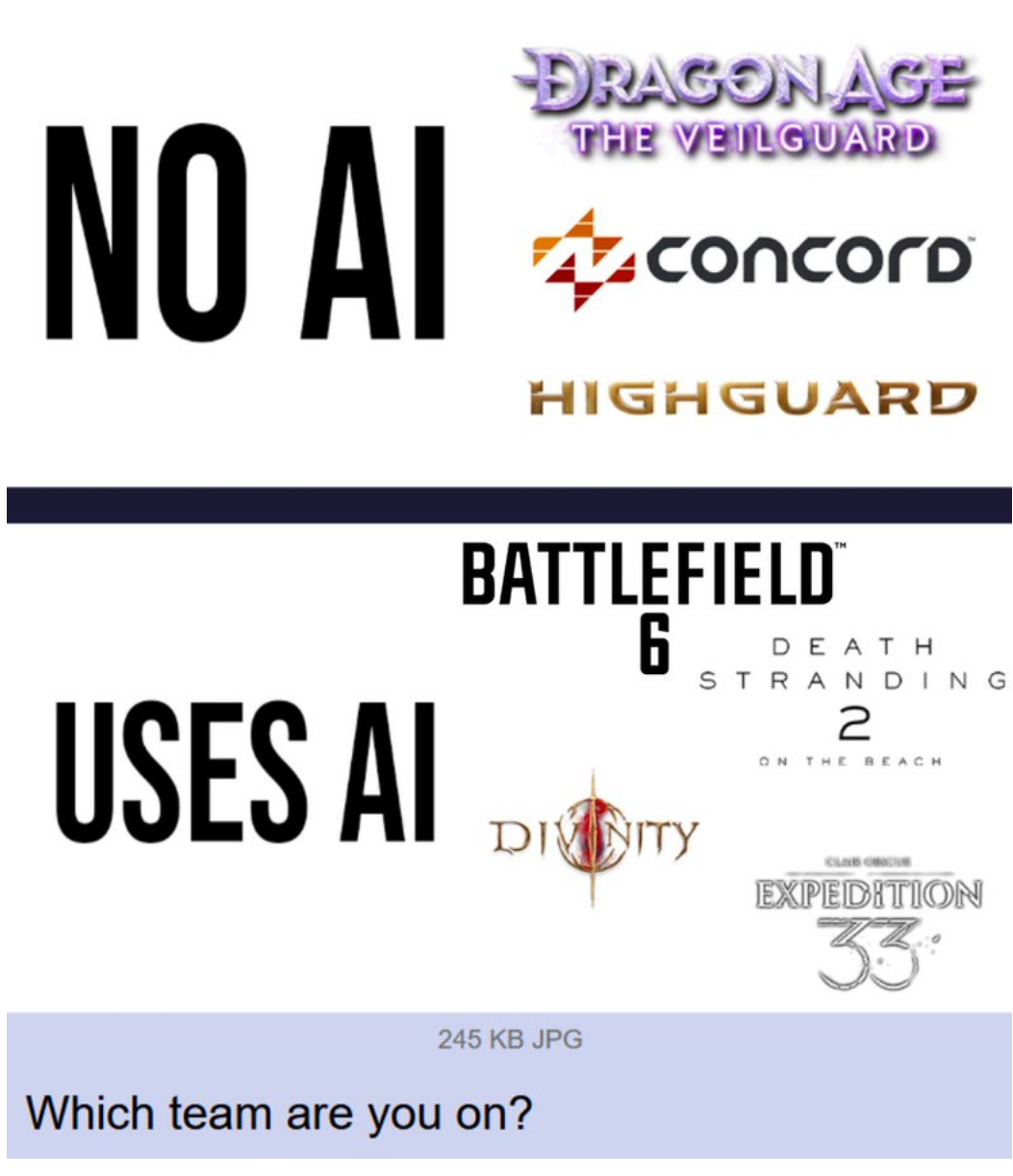 >>551832189Need Cyberpunk 2077, Ark Raiders, Deadlock, and Finals on the bottom. The best modern games all use AI.