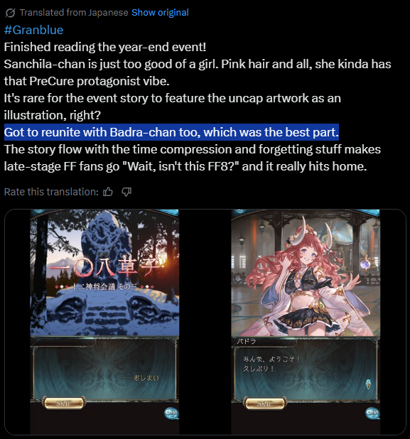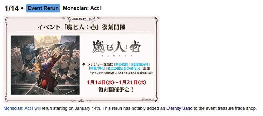 Granblue Fantasy FES 2025 Stream:https://www.youtube.com/watch?v=65WVhRSv92khttps://www.youtube.com/watch?v=Hv6TxWMnLfQ>Recent NewsG. Bhaisha (Earth) & Amaterasu (Light) now availableExtra Drops (Water) - (12/22 - 12/29)New Year's Special campaign - (12/23 - 1/12)Daily Roulette/200 Crystals, Bubz Summon Giveaway, MSQ Rewards, CEQ, x1.5 XP/RP, ½Off AP/BP/Hosts, ½Off Side Story & Trade items, FP Special, x3 AH Pro, Double Sephira Gauge etc.Odious Raid series (Fire & Water) - LiveRemaining Odious Raid series - Feburary & AprilAlbert, Medusa & Caim NY Skins - 12/31Makura FLB - January"Showtime" Added to Side Stories - 01/20QoL - Subaha, Hexa and Mastery Trial Nerfs - FebruaryNew Xeno Realm in Sandbox - FebruaryFinal Tower of Babyl & Permanent AdditionPro Skip for World Treasure Mats - MarchSiete & Vikala 12th Anniversary Skins - MarchLancer Origin Class - MarchSteam Client - 03/10Roadmap: https://gbf.wiki/User:Umikin/Timeline>December Schedule12/15 - 12/30 - Holiday Messages12/22 - 12/29 - Exo Vohu Manah12/25 - 12/29 - Auld Lang Syne: The Bonitomurai Strikes Back12/29 - 01/06 - Tale of the 108>Future Schedule01/07 - 01/14 - Rise of the Beasts01/14 - 01/21 - Monscian01/21 - 01/28 - Unite & Fight (Earth Adv.)02/14 - 02/28 - Alchemist Event02/19 - Dread Barrage (Wind Adv.)>How to StartGo to https://game.granbluefantasy.jp in any Chromium-based browser>READ THE FAQ before posting - It will answer most of your questions if you're new or learninghttps://gbf.wiki/FAQ>Helpful links - These links contain useful information like important guides and other stuffGranblue Fantasy Toolbox - https://mizagbf.github.io/GBF Advanced Search - https://gbfas.ioGBF Grid and Teambuilding - https://gbfguide.comMain Story Recap - https://calico.nekoweb.org/gbf/story/Wiki Advanced Grids - https://gbf.wiki/Advanced_Grids/gbfg/ Mega Pastebin - https://pastebin.com/xHkyQTy8/gbfg/ Crew Directory - https://rentry.org/gbfgcrewsPrevious >>551783643