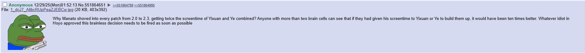 >>551879664>>551879398Blame HSR for being legit dead right now. 4.X should be getting hyped and instead we have legit nothing but doomer messages