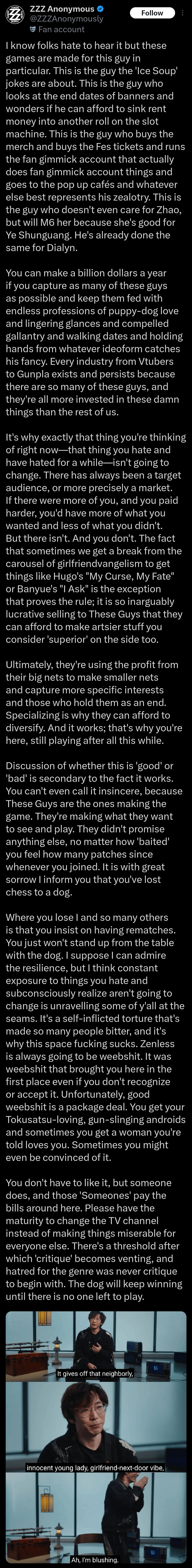 2.x has been but a long strings of bad decisions>making yi xuan too OP resulting in devs being cornered and having to sideline her for the rest of 2.x>making fufu barely better than Qingyi>teasing S.anby buffs right before releasing the agent with the same role and element>bait and switch with SEED, also the mech itself is ugly as sin (wearing dress wtf)>yidhari and lucia out of fucking nowhere with AI generated designs, copying the same yi xuan pants>banyue is LOL>shunko with no foreshadowing at allChinks are infinitely tolerant thanks to the word HOYO otherwise this game should have gone EOS