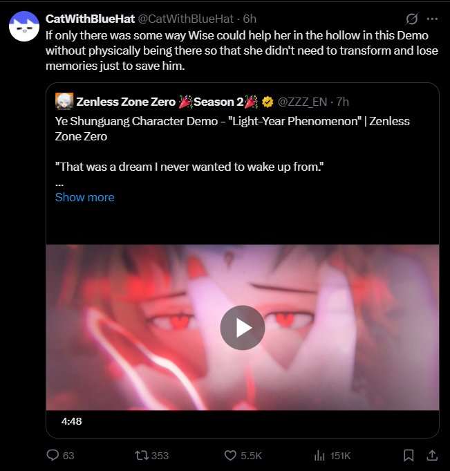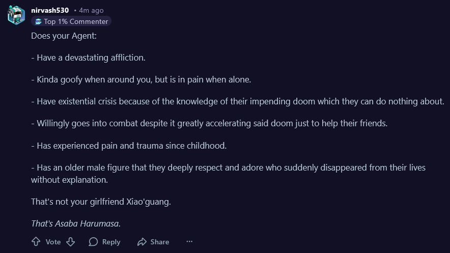 I am getting tired of how utterly stupid the ZZZ developers are. Sick of their apologies. There's nothing wrong with Ye Shunguang's story, it's the execution. It's all cramped into 1.5 patches so it doesn't work. There's no reason why she couldn't have just been an npc at the temple since 2.0 that we talk to, have a "date" with once a patch. It would have worked just fine and I probably would like her. Instead she's just cringe.