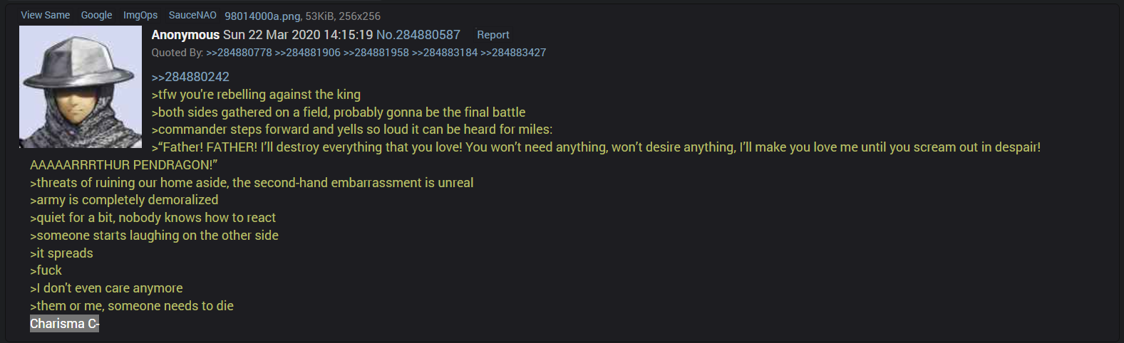 >>551886990The in-universe story is just an autist going on a melty and fucking up everything.The meta story is that FGO is a social experiment by Nasu to see how far he can push the playerbase with awful writing and decisions without them quitting.The fake ending is the culmination of this. By giving them time to think this is the real conclusion, it also lets them make fools of themselves by vehemently defending it, when the real ending will make a complete mockery of it.