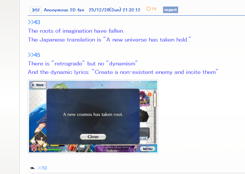 >>551887546>realistically, when would Nasu reveal the fake out ending if there was one?I assume they are waiting for the last possible moment before NY to do it.Last year we had a story available only from reset to midnight JST on the 31st for the Arcueid raids.It's genuinely up to them how to handle it but being so quiet on their social media as there's unrelated things they should promote like the NY stream or Maaya's song smells of ARG incoming.