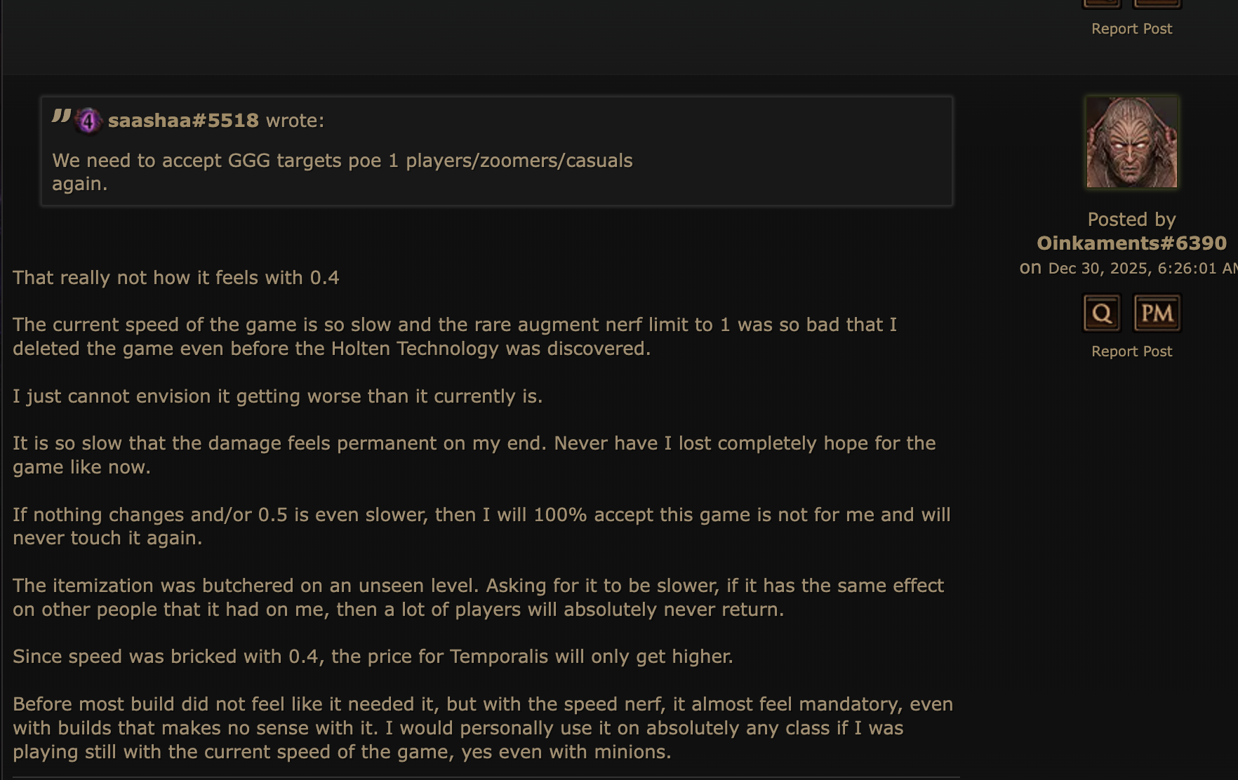 After pushing myself hard this league, I’ve started questioning why there are no positive scaling modifiers that let players shape their experience. We already have countless ways to make private leagues harder (plus Ruthless), yet nothing that accelerates progression for players who want to experiment, reroll, or simply respect their time.Rarity, quantity, currency, and gold are already adjustable values on players, monsters, and zones. It doesn’t seem unreasonable to allow optional modifiers—especially in solo or private environments—to speed up progression. I love PoE and want to try many builds, but leveling and gearing even one character is extremely time-consuming, and the economy inflates so fast that rerolling becomes impractical. Crafting is still a massive gamble; with fracturing orbs costing 9+ divines, meaningful upgrades are locked behind either extreme luck or endgame farming on a build you may not even enjoy.“Just play a cheap build” falls flat when that still requires huge time investment. Standard isn’t a real alternative either: items are overpriced, traders are inactive, and self-farming rare gear is still unrealistic.Difficulty matters, but it feels punishing when you don’t exploit early strategies or niche interactions. An enhanced SSF option with 3–5× currency wouldn’t trivialize progression—you’d still need to craft, plan, and engage with systems—but it would soften failed gambles and respect players’ time. In a solo environment, perfect balance isn’t even required.The game increasingly feels designed around constant play and staying ahead. Adjustable item-find could let players define their own fun without harming others. I’ve played for years and love this game, but I hate how it makes me feel now. I’d love an honest discussion on why this isn’t feasible beyond the usual answers. Is it really game-breaking if a divine drops 3× as often, or a fracturing orb is 1-in-10 instead of 1-in-100?