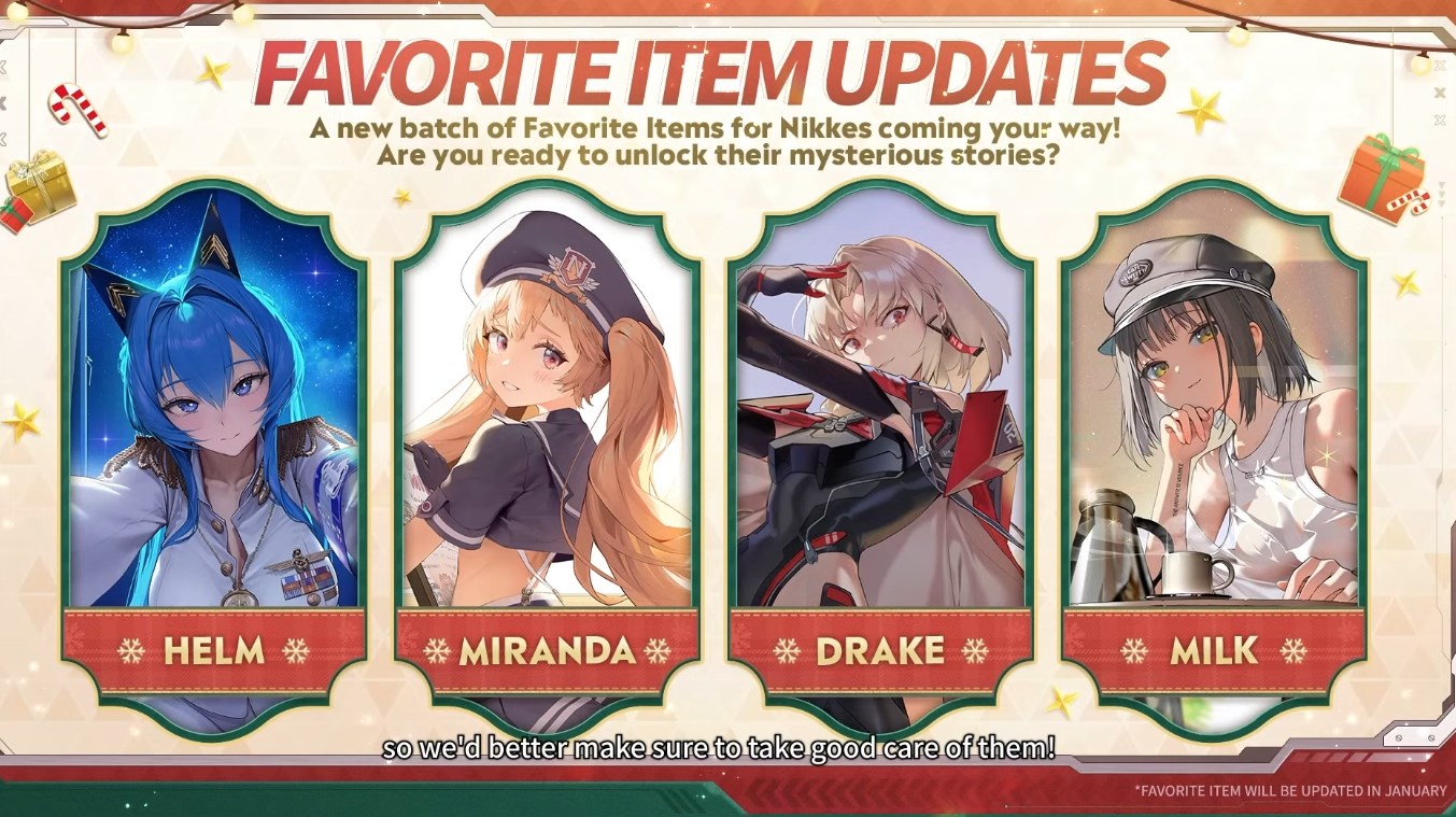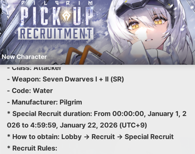 >December 29 LivestreamEN: https://www.youtube.com/live/9UC0otkeykoKR: https://www.youtube.com/live/6AkIsvzO0WQJP: https://www.youtube.com/live/754YEUnHl38>Game Download - Android/iOS/PChttps://nikke-en.com/index.html>General Info/FAQ for New Playershttps://rentry.org/NikkeInfo>Additional Linkshttps://rentry.org/nikghomeALL DATES/TIMES LISTED BELOW ARE UTC+9 (KOREA TIME)>Update on December 30https://nikke-en.com/newsdetail.html?content_id=39c0a1baaa6e2a4974a8f58a8e859cbd14ff>Developer's Note: December 2025https://nikke-en.com/newsdetail.html?content_id=cdd4dd28a9a71a464ca8afdac52e5bb9b7fb>Current EventsTERMINUS TICKET - December 4 ~ December 30>Upcoming EventsARK GUARDIAN - December 30 ~ January 22Union Raid - January 2 ~ January 8Coordinated Operation: Chatterbox - January 2 ~ January 4Solo Raid - January 8 ~ January 15>Current Special RecruitsBrid: Silent Track - Dec 11 ~ Dec 31>Upcoming Special RecruitsSnow White: Heavy Arms - January 1 ~ January 22Rapi: Red Hood [Rerun] - January 1 ~ January 22>Current Costume PassesBlanc: Fortune Express [Gacha] - December 4 ~ December 30Bready - Frosty Bite [Mission Pass] - December 4 ~ December 30Emma - Color Me Red, Vesti - Ark Mage & Volume - Beat the Gun [Shop rerun] - December 4 ~ December 30Jackal: Class Troublemaker [Mission Pass] - Dec 1 ~ Dec 31>Upcoming Costume PassesAlice: Märchen Dream [Gacha] - January 1 ~ January 22Quency Escape Queen: Masquerade Swan [Mission Pass] - January 1 ~ January 22Emma Tactical Upgrade: Secret Therapy [Mission Pass] - January 1 ~ January 30Guillotine: Dark Tracer, Helm: Chandelier & Maxwell: Mechanic White [Shop rerun] - January 1 ~ January 22>Codes2026HAPPYNEWYEAR2026KEEPTACTICAL2026WORKHARDER2026LETSDANCE2026EATBETTERNIKKEASSEMBLE3RD3YEARSWITHNIKKEGODDESSASSEMBLEthxfor990000thxfor980000thxfor970000thxfor960000DWAVECOMINGPrevious: >>551920325