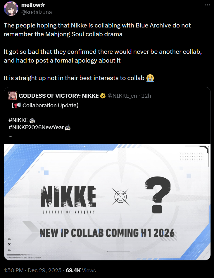 I just realized the collab teaser doesn't actually have any hints for what the collab is. Everything in it is themed around Nikke. The X is a crosshair because Nikke is a shooting game. The color is Nikke's UI blue, every graphical element is common to Nikke. If they wanted to hint at what the collab is they'd have written the "?" in a different font like Re:Zero did, but they used Nikke's.