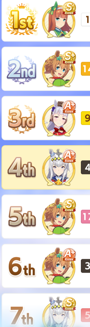 Previous: >>551955085>Global Game NewsLink your account to Cygames iDCurrent Scenario: Aoharu Hai aka "Unity Cup"Current CM: Scorpio Cup - Tokyo Turf 2000mCurrent Event: Fuji Kiseki ShowtimeCurrent Rate Up Trainee: Tosen Jordan 3*, Mejiro Dober 3*Current Rate Up Support Cards: Kitasan Black (SSR), Daitaku Helios (SSR), El Condor Pasa (SSR), Vodka (SR)Late January - Sagittarius Cup - Nakayama Turf 2500mhttps://umamusume.com/news/100040/https://pages.snep.pw/uma/anni-skill-changes/>JP Game NewsCurrent Rate Up: NY Sakura Laurel 3*, NY Ikuno Dictus 3*, Oguri Cap 3* (Forma de Cinderella), Stay Gold 3*, Air Groove (Speed SSR), Fine Motion (Power SSR) Inari One (SSR), Mejiro Dober (SR)New Scenario "Yukoma Hot Spring" releasedTimeline: https://uma.moe/timelineCygames Webstore: https://webstore.cygames.com/en/umamusume_en/>IP NewsUmamusume Cinderella Gray 2nd season started weekly airings on 10/5>Thread Clubshttps://rentry.co/umaglobalclublistYou must be E3 (20k points) to join a circle. Apply with /uma/ or /vg/ in your profile or post ID in the thread.>All Guides & Resourceshttps://rentry.org/uma26Game databasehttps://gametora.com/umamusume (Click the gear to switch between JP / global server info)A basic guide for newfagshttps://rentry.org/umaglobalFind networks if your region is blocked from the game or clienthttps://www.umavpn.top/93Seiyuu & Concertshttps://rentry.org/umstUma Texthttps://umareader.idsmile.xyz/