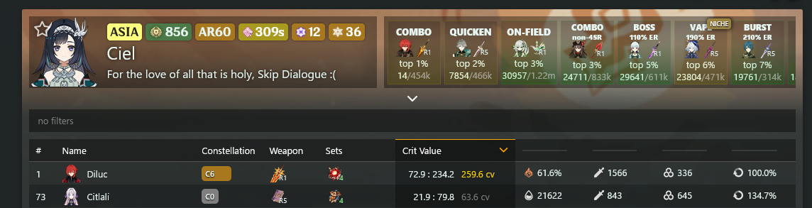 >>552022371>diluc, a standard character, is c6>weapon is r1>citlali is c0 with a 3* weaponnow post the hu tao's cons and refinements