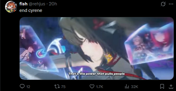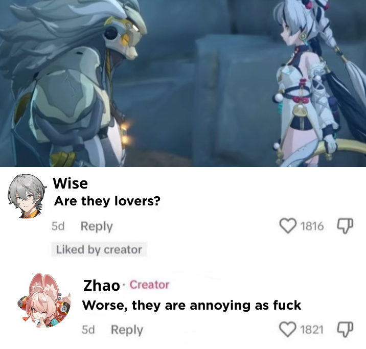 /hsrg/ here, why are people seething about the new not!archon girl? The way she acts toward the MC with the pandering stuff doesn't seem much different from main push girls acting that way older, non genshin gacha. Hell, you guys got more (you) pandering than us because we only firefly, Cyrene and castorice