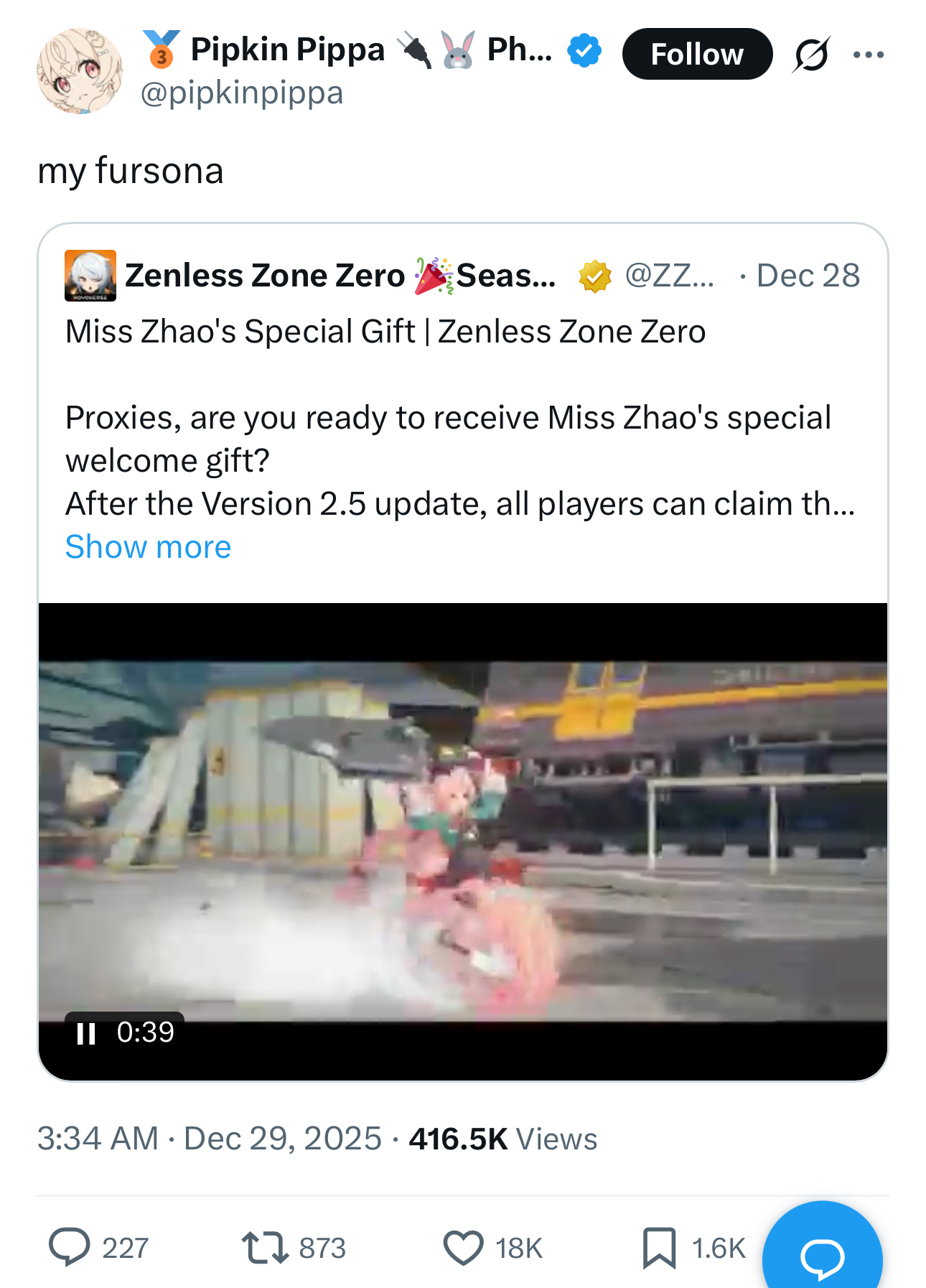 Previous:>>552056>NewsVersion 2.5 Special Programhttps://youtu.be/Ldeqt2WMiYMTGA 2025 Special Videohttps://youtu.be/X-g1N9mNjzsAgent Record | Ye Shunguanghttps://www.hoyolab.com/article/42397862Agent Record | Zhaohttps://www.hoyolab.com/article/42343300>Newest Trailer/Teaser/Character demohttps://youtu.be/35fRoOYhE6Y (EN)https://youtu.be/BSKG5nhlj5s (JP)https://youtu.be/D_MtaEZRy3E (EN)https://youtu.be/eJBlfglfs-4 (JP)https://youtu.be/9Lshum4Peqw (EN)https://youtu.be/oCcNiUZ5ogU (JP)https://youtu.be/TU5Bt8MLPjk (EN)https://youtu.be/bviZmH3w5ew (JP)>Upcoming Events for 2.5https://zenless.hoyoverse.com/en-us/news/161728All-New Program 12/29 - 02/05Special Visitor 12/29 - 02/09Potential Hypothesis New Chapter Reforged 12/29 - 02/09Sword Seeker Chronicles 12/31 - 02/05Joint Investigation: The Divine Maze 01/03 - 01/22Shadow Riptide Clash 01/09 - 01/26Wish Filing Station 01/14 - 02/02Advanced Bounty: Area Patrol 01/16 - 01/21"En-Nah" Into Your Lap 01/21 - 02/05Angels and Delusions of Muse 01/21 - 02/05Data Bounty: Combat Simulation 01/30 - 02/04Angels of Delusion Training in Progress 01/30 - 02/09>Redeemable codes (claimable in-game or online)https://zenless.hoyoverse.com/redemptionZENLESSGIFTZZZ24KRAMPUSZZZCREATOR25ZZZ25MINAZHAOISFREEMEETTHEVOIDHUNTERShunguangWinterGiftZZZ2026>Resources and useful linkshttps://rentry.org/zzzlinkshttps://rentry.org/ZZZ-Friendshttps://rentry.org/ZZZ-Guilds>/zzz/ OP pastebin (use this if making new thread):https://pastebin.com/PzbMf13P124