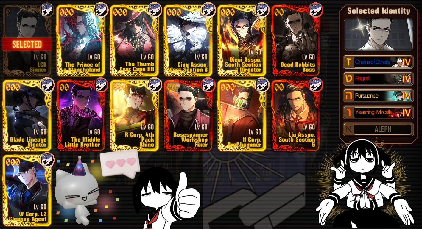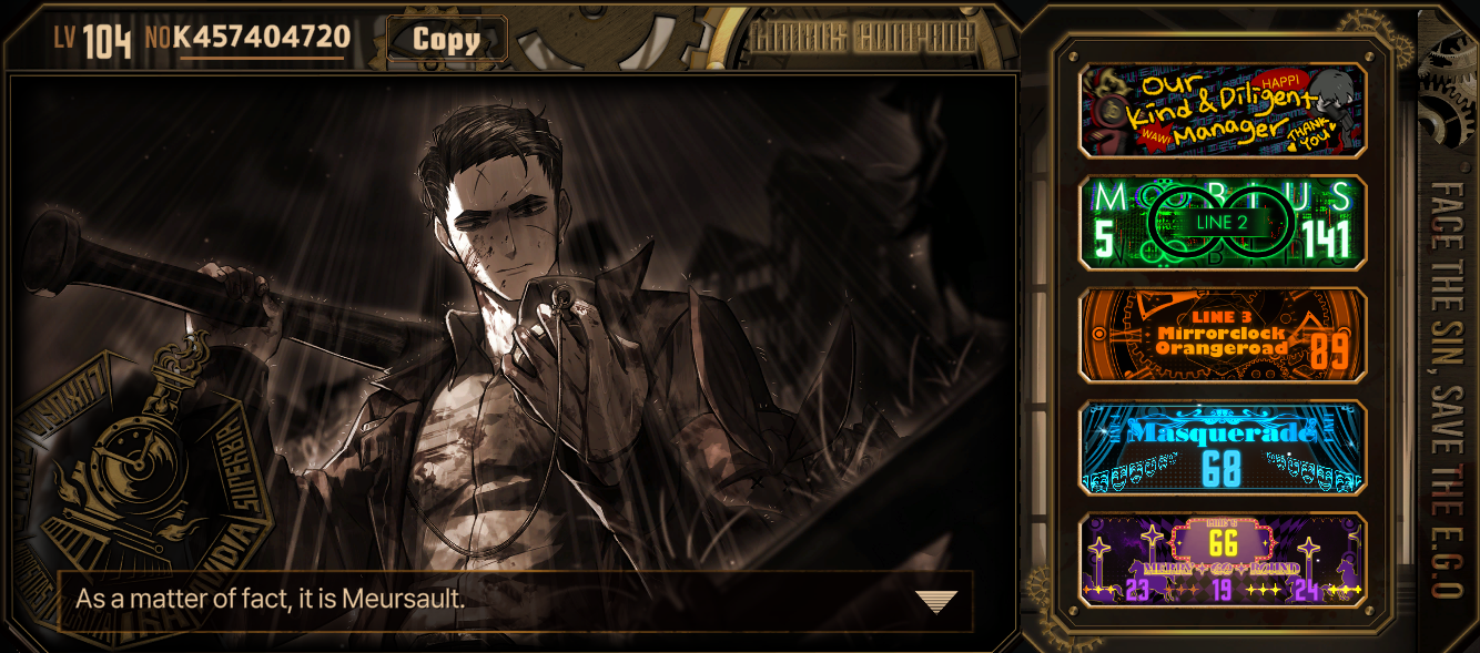 Previous thread: >>552050770Season 7 - Kumo no Ito2025.12.31 — Mirror Dungeon #6 - Mirror of Immortality2025.07.03 —Refraction Railway Line 5 - Merry Go Round2025.02.20 —>Current Events>Current Extractions2025.12.31 — 2026.01.15[000] The Index Proselyte:【Paper Slip】 Faust[000] LCA Udjat Vanguard Team 3 Leader Outis2025.12.31 — 2026.01.22Target Extraction: [ Ryoshu ] ID & E.G.O>FAQs! This game is directly tied to the setting of Project Moon's previous games, Lobotomy Corporation and Library of Ruina, and is set after both. Expect spoilers for those games in this thread.! The tutorial is important.>Download linksAppStore: https://apps.apple.com/app/limbus-company/id6444112366Google Play: https://play.google.com/store/apps/details?id=com.ProjectMoon.LimbusCompanySteam: https://store.steampowered.com/app/1973530/Limbus_Company/>Other linksOfficial twitter: https://twitter.com/limbuscompany_bOfficial youtube: https://www.youtube.com/@ProjectMoonOfficialOfficial site: https://limbuscompany.global>Required readinghttps://mega.nz/folder/xosDkZ5Z#Wt4JpUt5Bb2XG77pxuuXpw>For all your EGO and Sinner info needshttps://limbus.kusoge.xyz/https://gll-fun.com/en/>Useful resources and a general guidehttps://rentry.org/lcg_resourceshttps://rentry.org/lcbguidehttps://rentry.org/LCB_optimal_grind_guidehttps://lcb-days-since-last-id.carrd.co/https://lcb-days-since-last-ego.carrd.co/>Countdownhttps://lcbcountdown.carrd.co/