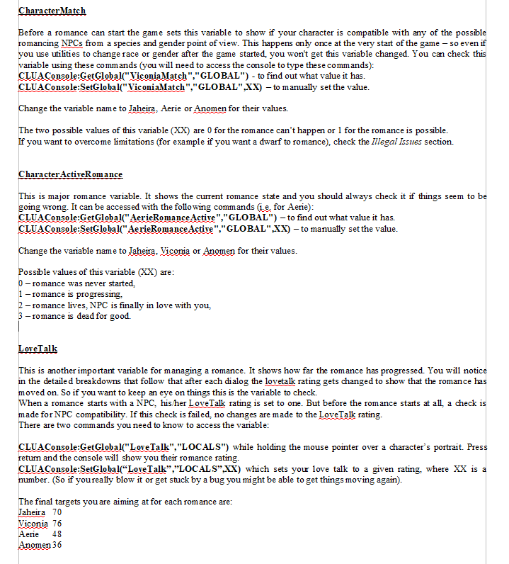 What commands do I use to check if the Viconia romance can happen in Throne of Bhaal?I made a similar post yesterday, but I wasn't in chapter 9 yet. Now I am, and beaten another major boss, but still not a word from her, even as we sleep in the tavern, or idle in the city.I did the Shadows of Amn romance with her as far as I know, perfectly. It still ended on that naturally unsatisfying note, but the wiki says it should restart again after we reach Akmethran.using the console to check ViconiaRomanceActive gives 3, and it was like that since I first started Throne of Bhaal.