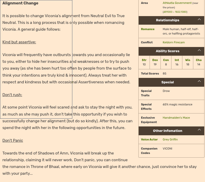 >>552104325That's the guide for shadows of amn.The throne of bhaal guide is separate.It sounds like in general there are 3 outcomes.1. romance fails2. evil Viconia ending3. good Viconia ending