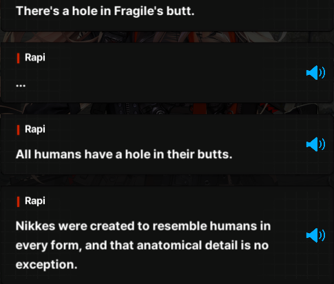 >>552104286i thought that was just a meme... that post i mean, its implied nikkes poop based off anis saying her ass doesnt stink in like one of the first scenes