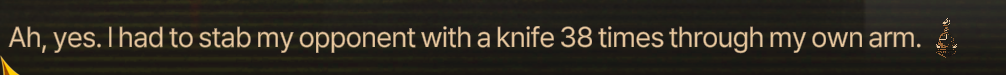>>552113625>Here's how you kill a man in 500 different ways>One of them involved me killing a guy with a knife stabbed inside me by stabbing him 38 times. Only after the 20th stab did it start to hurt.His "sanity" is a facade for being a ruthless killing machine. You can pinpoint people's weakness with emotion, but someone who lacks any is no better than a machine.
