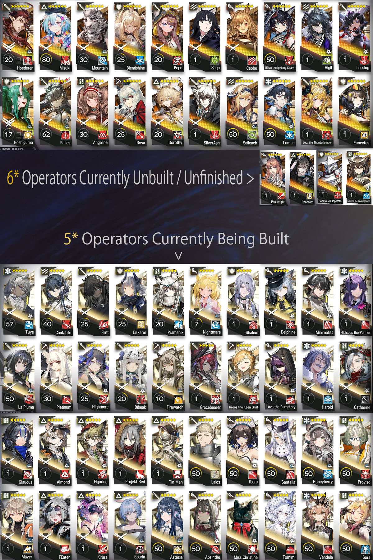 To any anon willing to give their two cents, any thoughts on which operators I should build once I'm done with Mizuki and Hoshi? The ones in the attached image are the 6* I have unfinished / the 5* that are sort of in the progress of being built. I've omitted a bunch of 5* that haven't been touched yet for brevity's sake.>>552134591E2* whoops