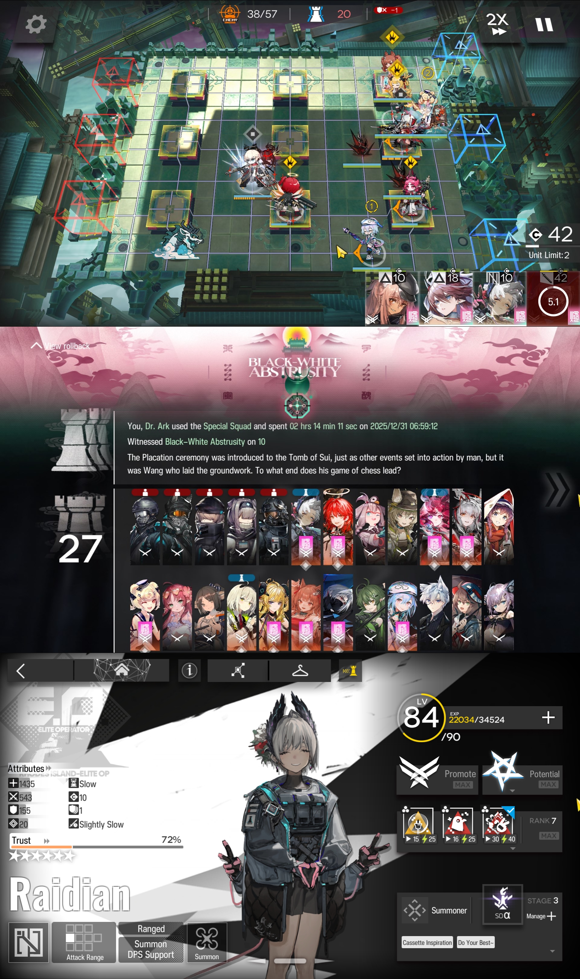 >defeat Yi on A2 with Lappland, Blaze, Yi and Wishadel>get Raidian to E2I don't feel like playing this version ever again. Everything about it is so dumb which is a feat in itself because there are at least 4 unique gimmicks about it. Like it's just boring, it is devoid of any fun.